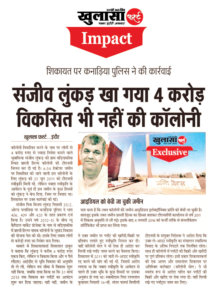 न विकास किया, न पैसे वापस लौटाए...एक शिकायतकर्ता शिवलाल ठाकुर का कहना है कि लुंकड़ ने करीब 4 करोड़ रुपए एकत्र किए थे, लेकिन न विकास किया और न पैसे वापस लौटाए। उसने आईडीए से भूमि विकास की अनुमति ले ली, लेकिन तय वक्त में विकास शुरू ही नहीं किया, जबकि दावा किया था कि 31 मार्च 2013 को प्लॉट विकसित कर आवंटित कर दिए जाएंगे, लेकिन जब उसने ऐसा नहीं किया तो टीएनसी निरस्त कर दी गई और कलेक्टोरेट के कॉलोनी सेल ने भी बंधक रखे प्लॉटों को जब्त कर लिया।