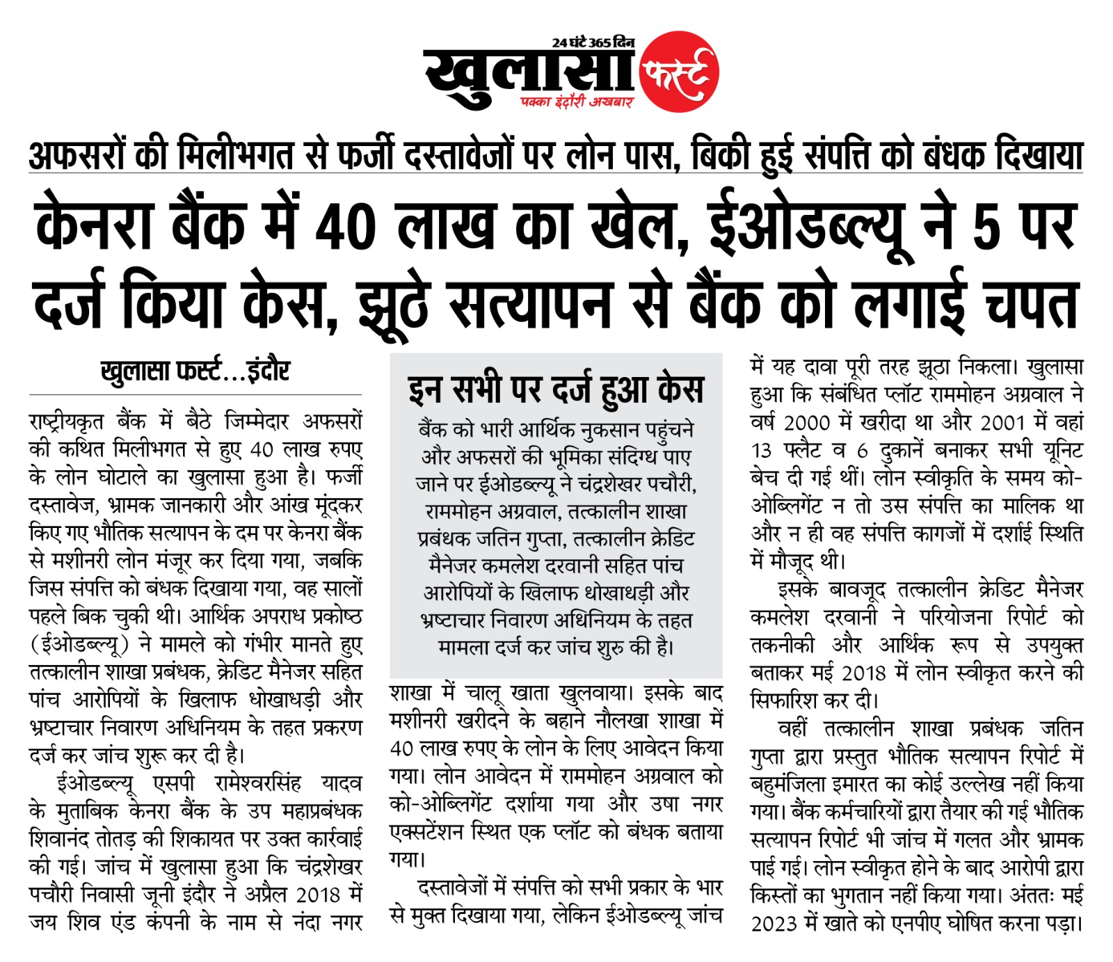 केनरा बैंक में 40 लाख का खेल: ईओडब्ल्यू ने 5 पर दर्ज किया केस; झूठे सत्यापन से बैंक को लगाई चपत
