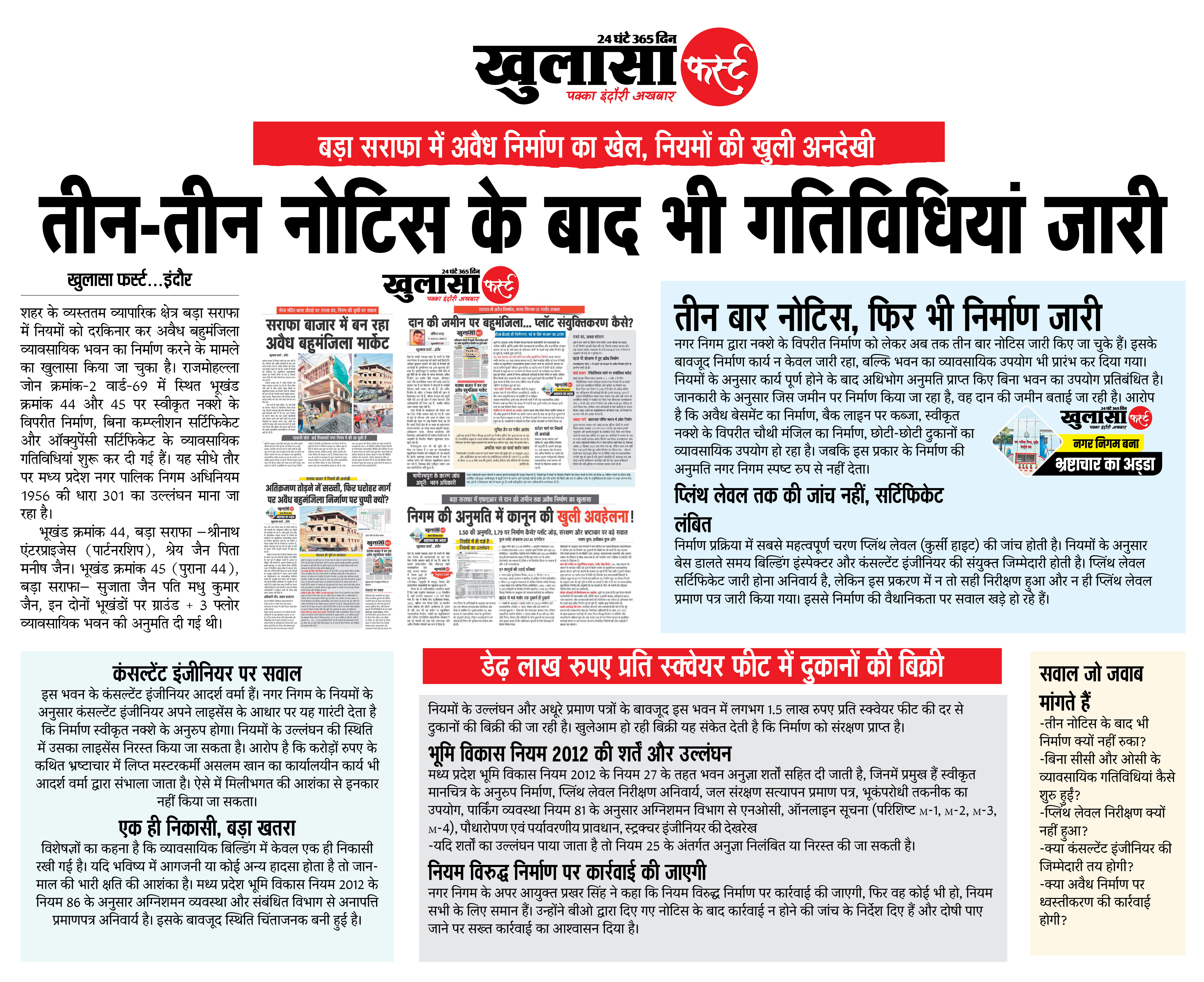 शहर के व्यस्ततम व्यापारिक क्षेत्र बड़ा सराफा में नियमों को दरकिनार कर अवैध बहुमंजिला व्यावसायिक भवन का निर्माण करने के मामले का खुलासा किया जा चुका है। राजमोहल्ला जोन क्रमांक-2 वार्ड-69 में स्थित भूखंड क्रमांक 44 और 45 पर स्वीकृत नक्शे के विपरीत निर्माण, बिना कम्प्लीशन सर्टिफिकेट और ऑक्युपेंसी सर्टिफिकेट के व्यावसायिक गतिविधियां शुरू कर दी गई हैं। यह सीधे तौर पर मध्य प्रदेश नगर पालिक निगम अधिनियम 1956 की धारा 301 का उल्लंघन माना जा रहा है।