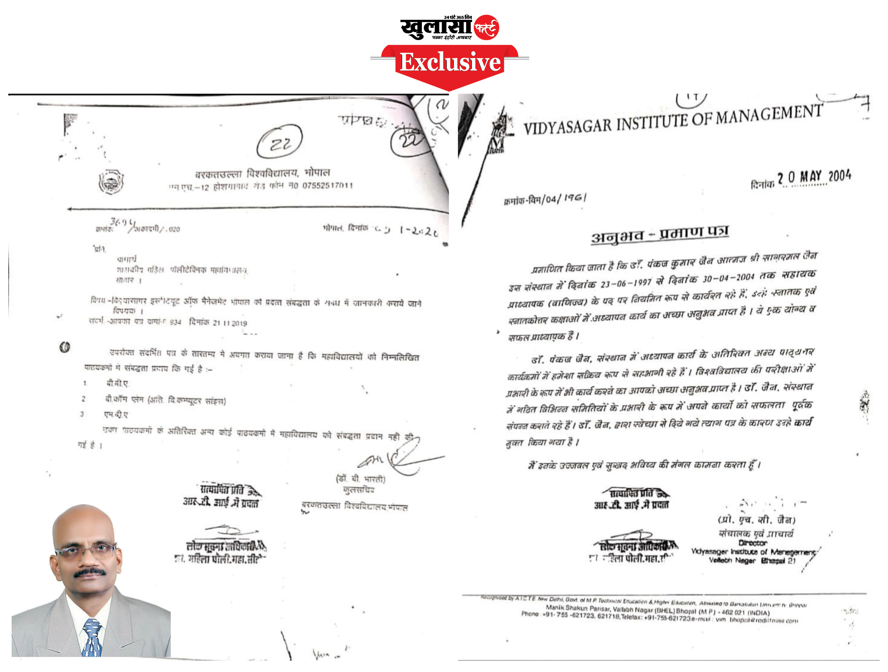 डॉ. जैन द्वारा यह अनुभव प्रमाणपत्र भोपाल स्थित विद्यासागर इंस्टीट्यूट ऑफ मैनेजमेंट से प्राप्त किए गए थे, और ऐसे प्रमाणपत्र कथित रूप से एक बार नहीं, बल्कि दो-दो बार अलग-अलग तारीखों में जारी किये गये।