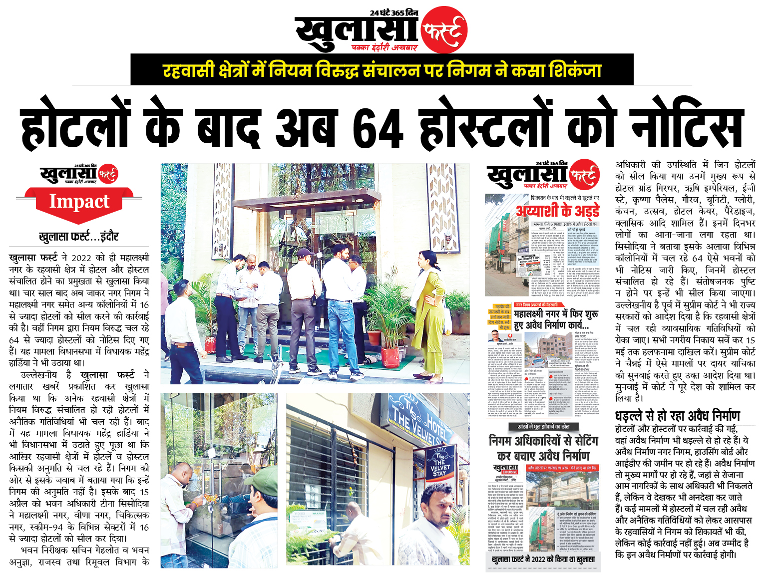 खुलासा फर्स्ट ने 2022 को ही महालक्ष्मी नगर के रहवासी क्षेत्र में होटल और होस्टल संचालित होने का प्रमुखता से खुलासा किया था। चार साल बाद अब जाकर नगर निगम ने महालक्ष्मी नगर समेत अन्य कॉलोनियों में 16 से ज्यादा होटलों को सील करने की कार्रवाई की है। वहीं निगम द्वारा नियम विरुद्ध चल रहे 64 से ज्यादा होस्टलों को नोटिस दिए गए हैं। यह मामला विधानसभा में विधायक महेंद्र हार्डिया ने भी उठाया था।