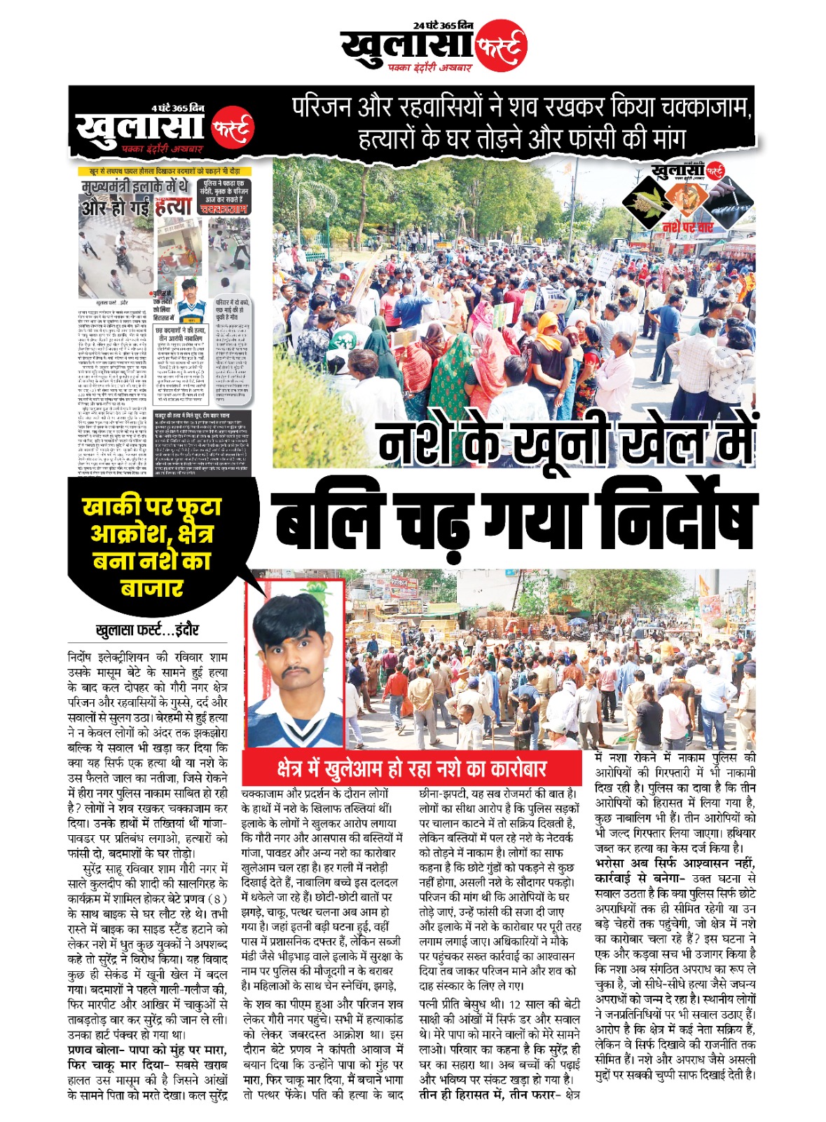 निर्दोष इलेक्ट्रीशियन की रविवार शाम उसके मासूम बेटे के सामने हुई हत्या के बाद कल दोपहर को गौरी नगर क्षेत्र परिजन और रहवासियों के गुस्से, दर्द और सवालों से सुलग उठा। बेरहमी से हुई हत्या ने न केवल लोगों को अंदर तक झकझोरा बल्कि ये सवाल भी खड़ा कर दिया कि क्या यह सिर्फ एक हत्या थी या नशे के उस फैलते जाल का नतीजा, जिसे रोकने में हीरा नगर पुलिस नाकाम साबित हो रही है? लोगों ने शव रखकर चक्काजाम कर दिया। उनके हाथों में तख्तियां थीं गांजा-पावडर पर प्रतिबंध लगाओ, हत्यारों को फांसी दो, बदमाशों के घर तोड़ो।