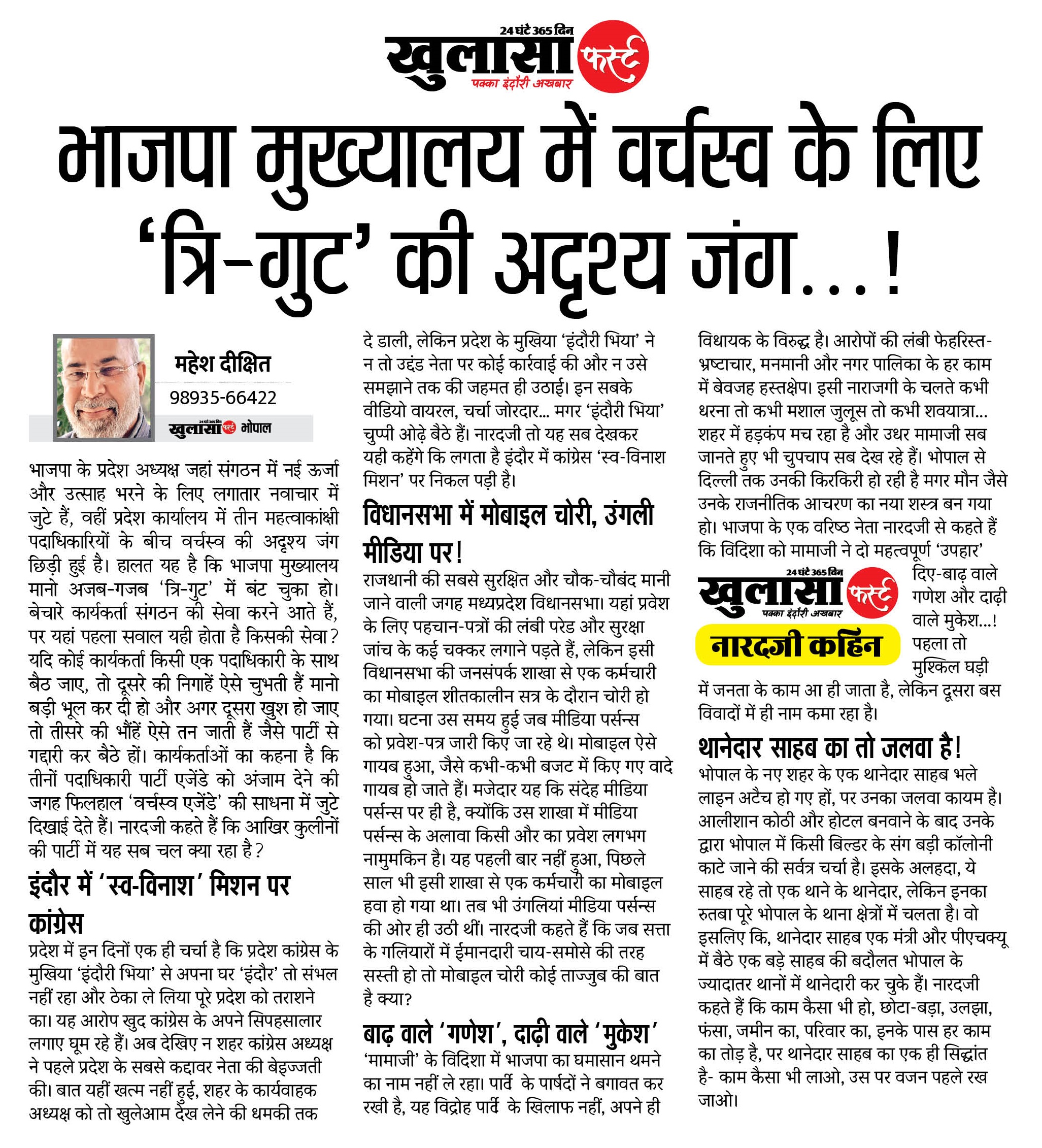 महेश दीक्षित 98935-66422 खुलासा फर्स्ट । भाजपा के प्रदेश अध्यक्ष जहां संगठन में नई ऊर्जा और उत्साह भरने के लिए लगातार नवाचार में जुटे हैं, वहीं प्रदेश कार्यालय में तीन महत्वाकांक्षी पदाधिकारियों के बी