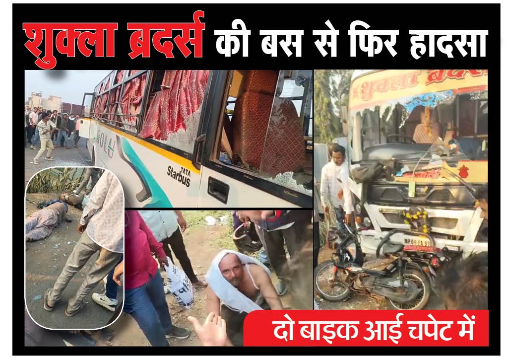 शुक्ला ब्रदर्स की बस से फिर हादसा: दो बाइक आई चपेट में; भीड़ का ड्राइवर-कंडक्टर पर हमला, जमकर की तोड़फोड़; महिला-बच्चा सहित चार हुए घायल