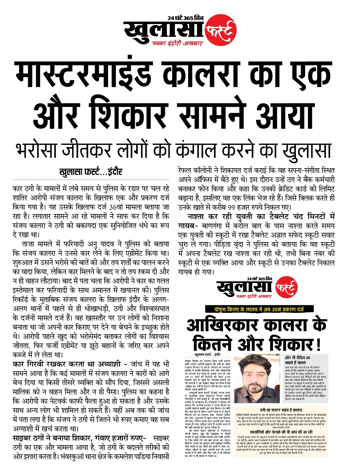 कार ठगी के मामलों में लंबे समय से पुलिस के रडार पर चल रहे शातिर आरोपी संजय कालरा के खिलाफ एक और प्रकरण दर्ज किया गया है। यह उसके खिलाफ दर्ज 36वां मामला बताया जा रहा है।