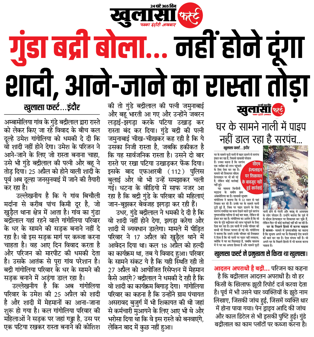 उल्लेखनीय है कि ये गांव बिचौली मर्दाना से करीब पांच किमी दूर है, जो खुड़ैल थाना क्षेत्र में आता है। गांव का गुंडा बद्रीलाल यहां रहने वाले गांगोलिया परिवार के घर के सामने की सड़क बनाने नहीं दे रहा है।