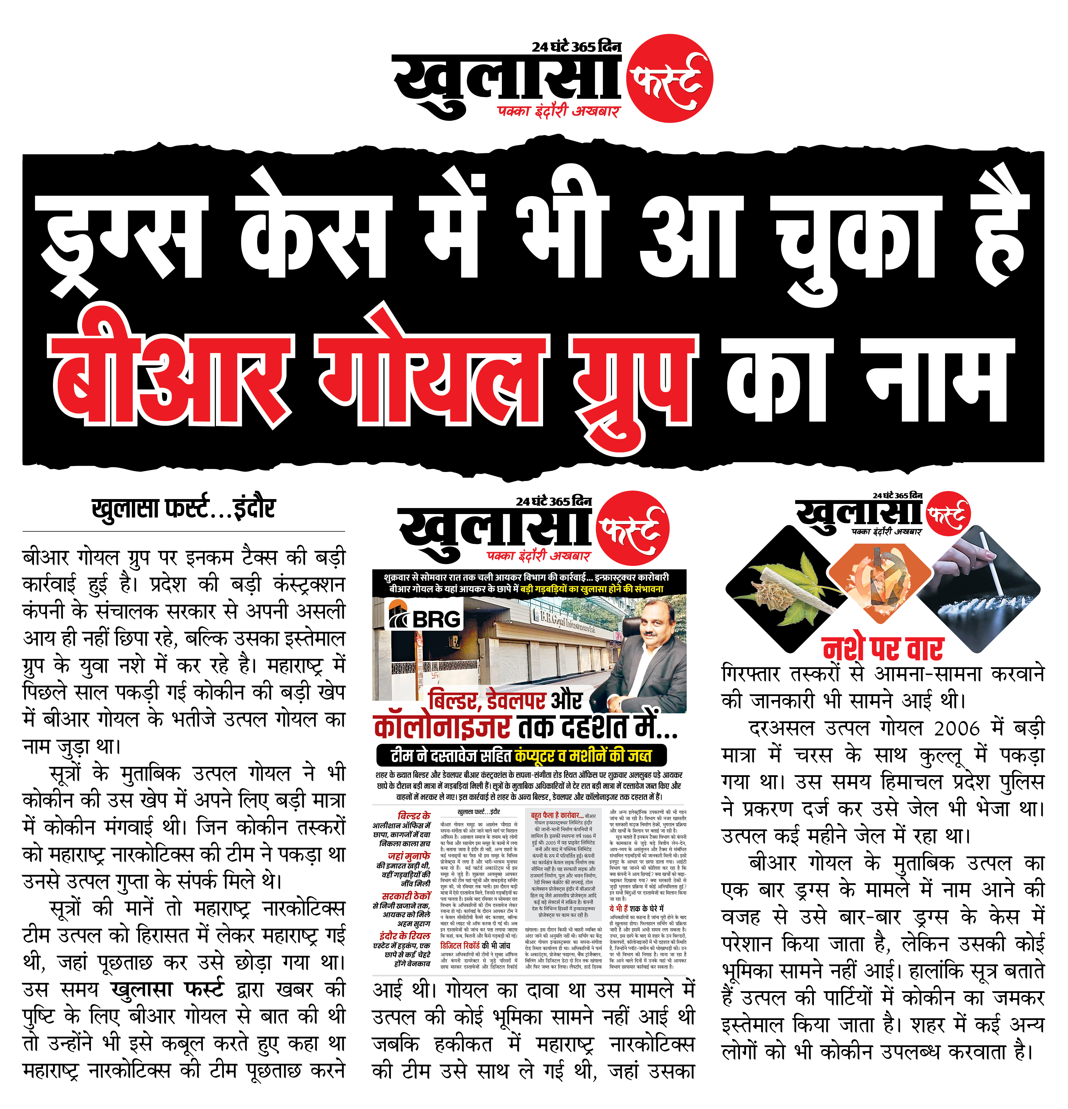 बीआर गोयल ग्रुप पर इनकम टैक्स की बड़ी कार्रवाई हुई है। प्रदेश की बड़ी कंस्ट्रक्शन कंपनी के संचालक सरकार से अपनी असली आय ही नहीं छिपा रहे, बल्कि उसका इस्तेमाल ग्रुप के युवा नशे में कर रहे है। महाराष्ट्र में पिछले साल पकड़ी गई कोकीन की बड़ी खेप में बीआर गोयल के भतीजेे उत्पल गोयल का नाम जुड़ा था।