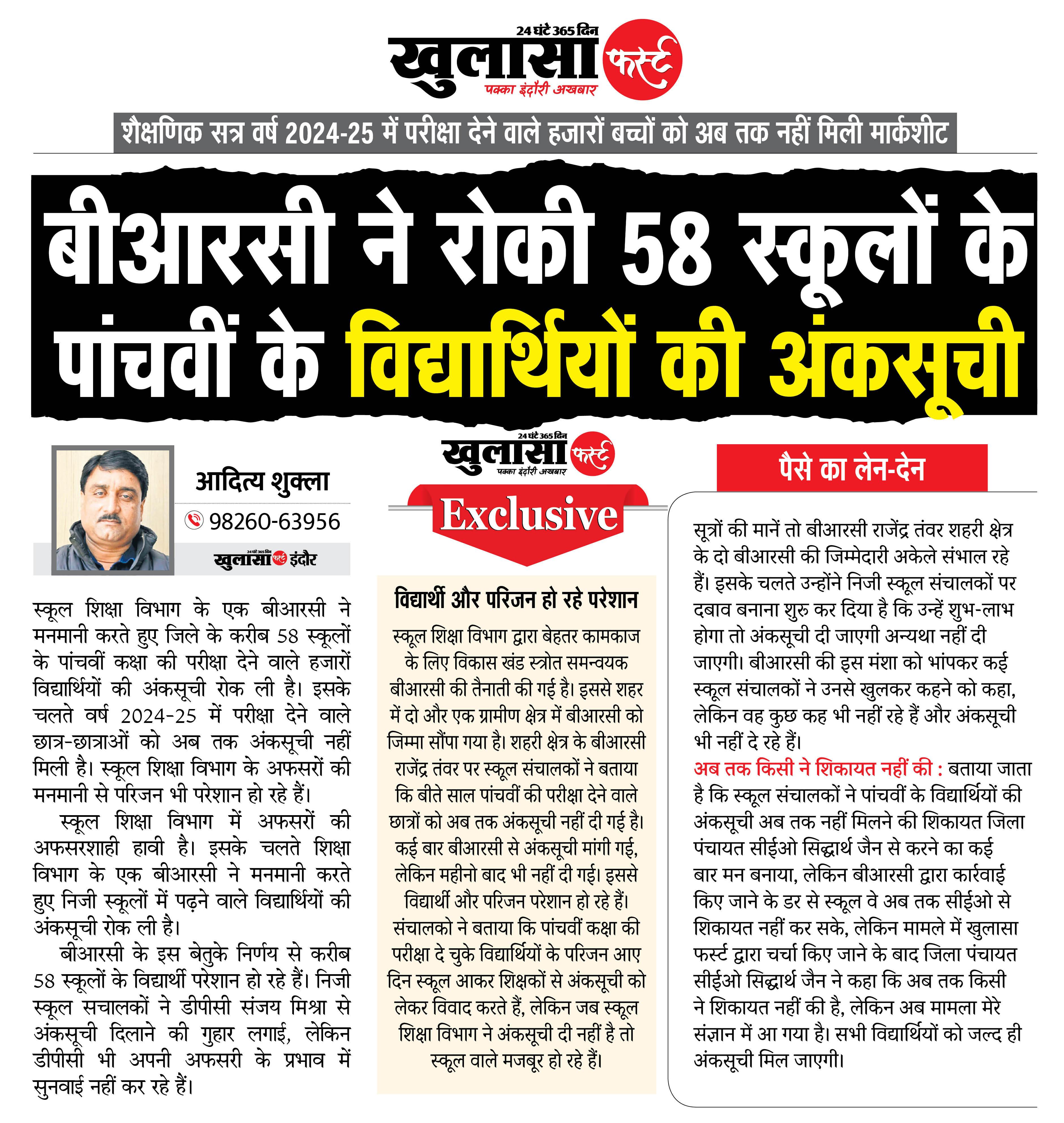 स्कूल शिक्षा विभाग के एक बीआरसी ने मनमानी करते हुए जिले के करीब 58 स्कूलों के पांचवीं कक्षा की परीक्षा देने वाले हजारों विद्यार्थियों की अंकसूची रोक ली है। इसके चलते वर्ष 2024-25 में परीक्षा देने वाले छात्र-छात्राओं को अब तक अंकसूची नहीं मिली है। स्कूल शिक्षा विभाग के अफसरों की मनमानी से परिजन भी परेशान हो रहे हैं।