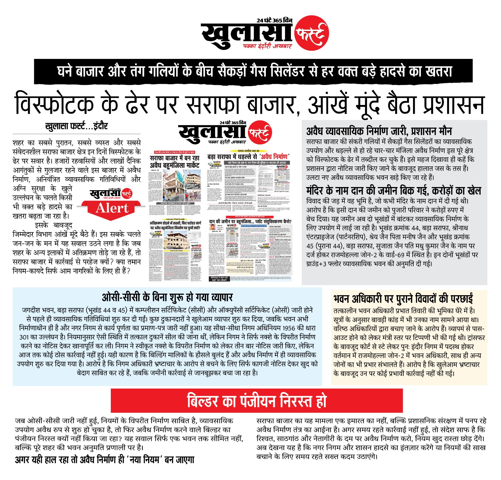 सराफा बाजार की संकरी गलियों में सैकड़ों गैस सिलेंडरों का व्यावसायिक उपयोग और धड़ल्ले से हो रहे चार-चार मंजिला अवैध निर्माण इस पूरे क्षेत्र को विस्फोटक के ढेर में तब्दील कर चुके हैं। इसे महज दिखावा ही कहें कि प्रशासन द्वारा नोटिस जारी किए जाने के बावजूद हालात जस के तस हैं। उलटा नए अवैध व्यावसायिक भवन खड़े किए जा रहे हैं।