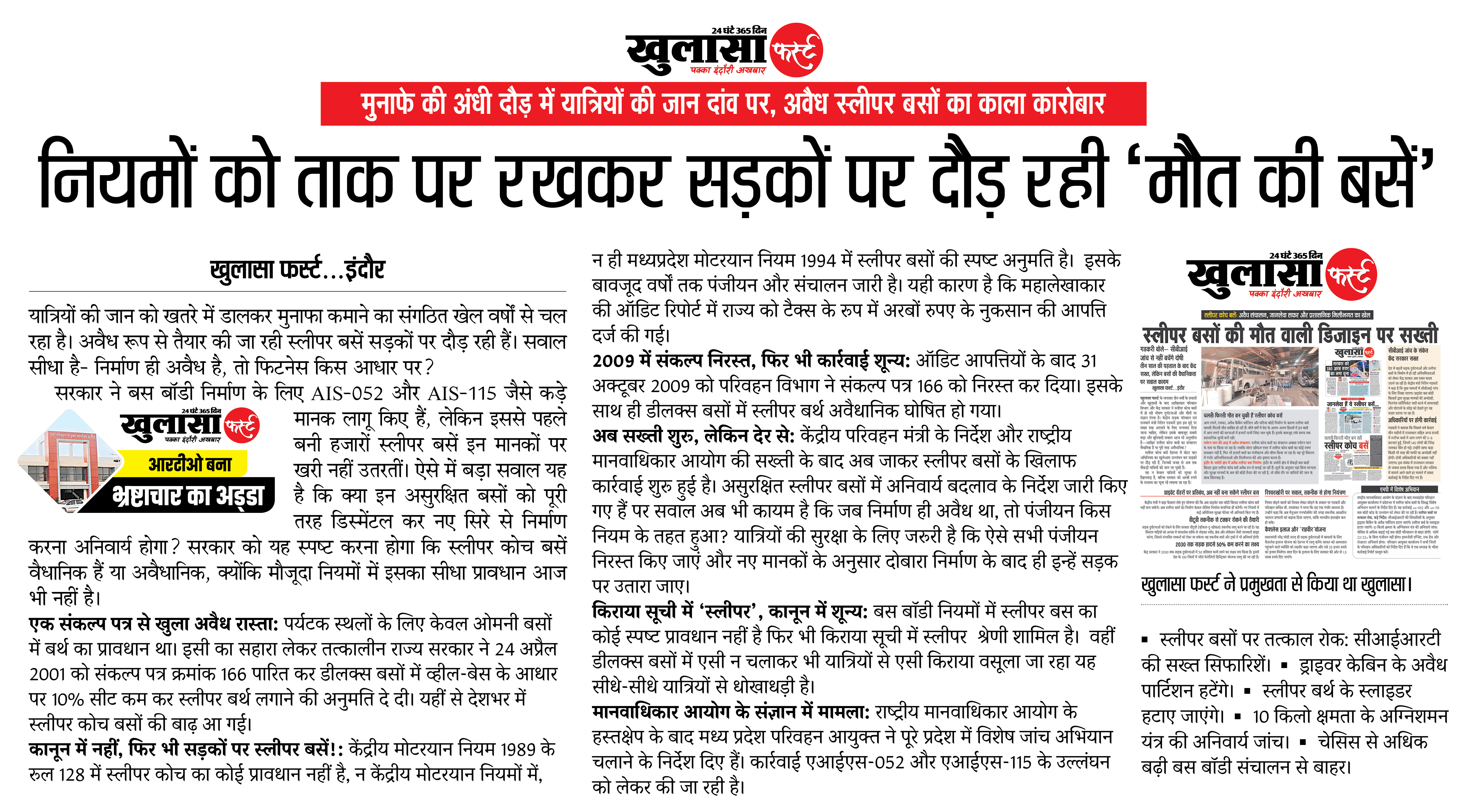 कानून में नहीं, फिर भी सड़कों पर स्लीपर बसें!: केंद्रीय मोटरयान नियम 1989 के रूल 128 में स्लीपर कोच का कोई प्रावधान नहीं है, न केंद्रीय मोटरयान नियमों में, न ही मध्यप्रदेश मोटरयान नियम 1994 में स्लीपर बसों की स्पष्ट अनुमति है।