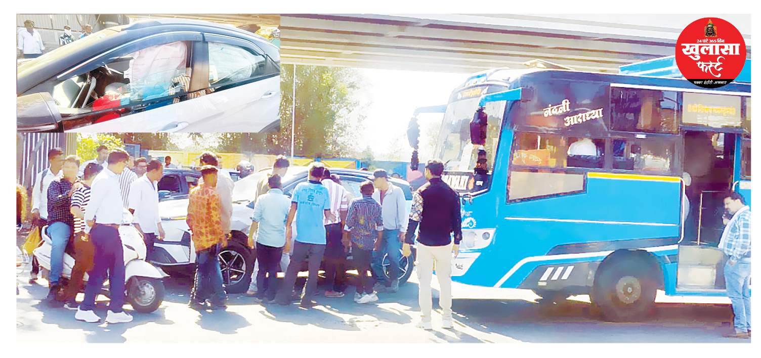 कार और बस की भिड़ंत: एयरबैग खुलने से कार सवार की जान बची
