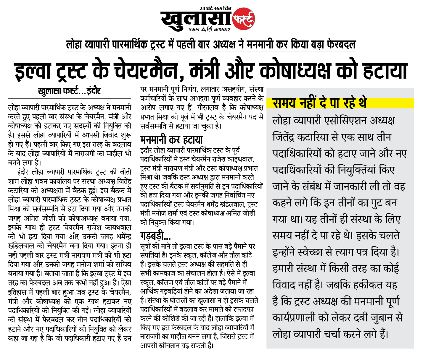 इल्वा ट्रस्ट के चेयरमैन: मंत्री और कोषाध्यक्ष को हटाया; लोहा व्यापारी पारमार्थिक ट्रस्ट में पहली बार अध्यक्ष ने मनमानी कर किया बड़ा फेरबदल