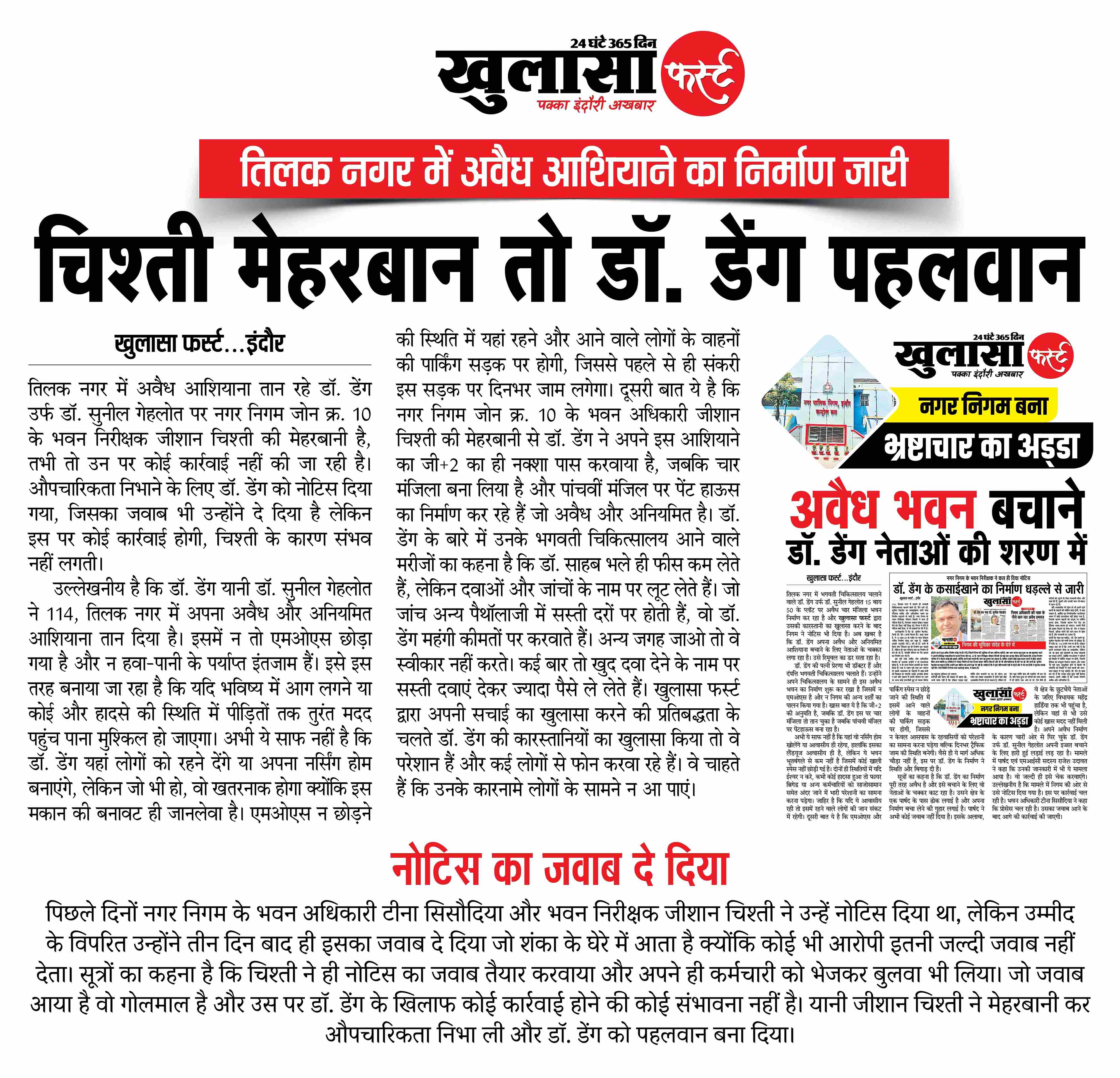 दूसरी बात ये है कि नगर निगम जोन क्र. 10 के भवन अधिकारी जीशान चिश्ती की मेहरबानी से डॉ. डेंग ने अपने इस आशियाने का जी+2 का ही नक्शा पास करवाया है, जबकि चार मंजिला बना लिया है और पांचवीं मंजिल पर पेंट हाऊस का निर्माण कर रहे हैं जो अवैध और अनियमित है।