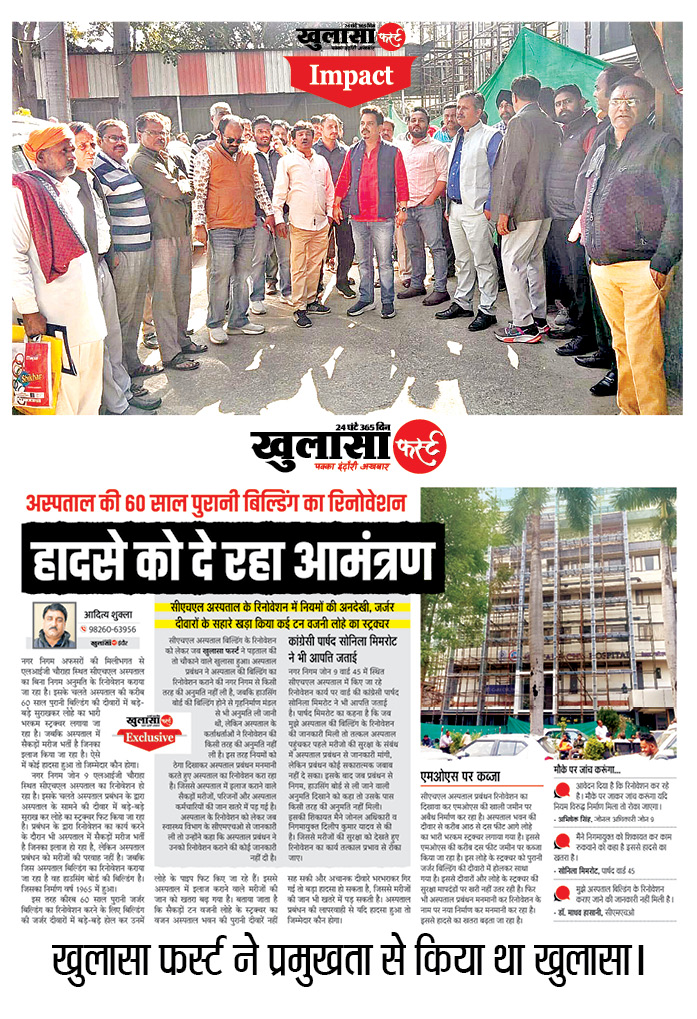 नगर निगम जोन-9 के वार्ड-45 एलआईजी तिराहा स्थित सीएचएल अपोलो अस्पताल में बिना अनुमति नए स्ट्रक्चर का निर्माण किया जा रहा है। इससे अस्पताल में इलाज कराने वाले मरीजों की जान को खतरा हो सकता है। इसे लेकर वार्ड के कांग्रेसियों ने अस्पताल परिसर में प्रदर्शन किया। इसके बाद निगम के भवन अधिकारी ने निर्माण कार्य पर रोक लगा दी। उक्त मामले में खुलासा फर्स्ट ने प्रमुखता से खुलासा किया था।