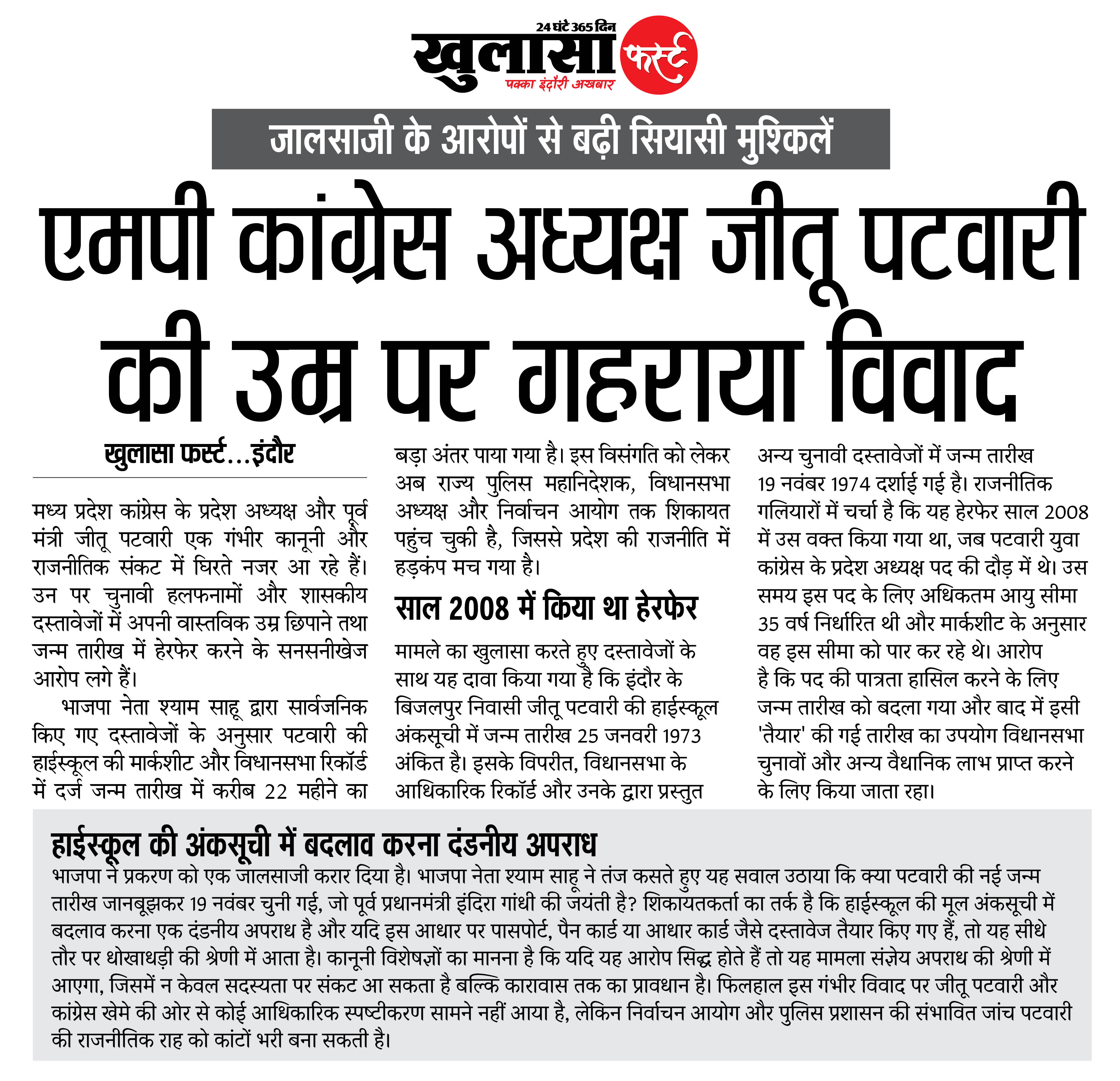 मामले का खुलासा करते हुए दस्तावेजों के साथ यह दावा किया गया है कि इंदौर के बिजलपुर निवासी जीतू पटवारी की हाईस्कूल अंकसूची में जन्म तारीख 25 जनवरी 1973 अंकित है। इसके विपरीत, विधानसभा के आधिकारिक रिकॉर्ड और उनके द्वारा प्रस्तुत अन्य चुनावी दस्तावेजों में जन्म तारीख 19 नवंबर 1974 दर्शाई गई है।