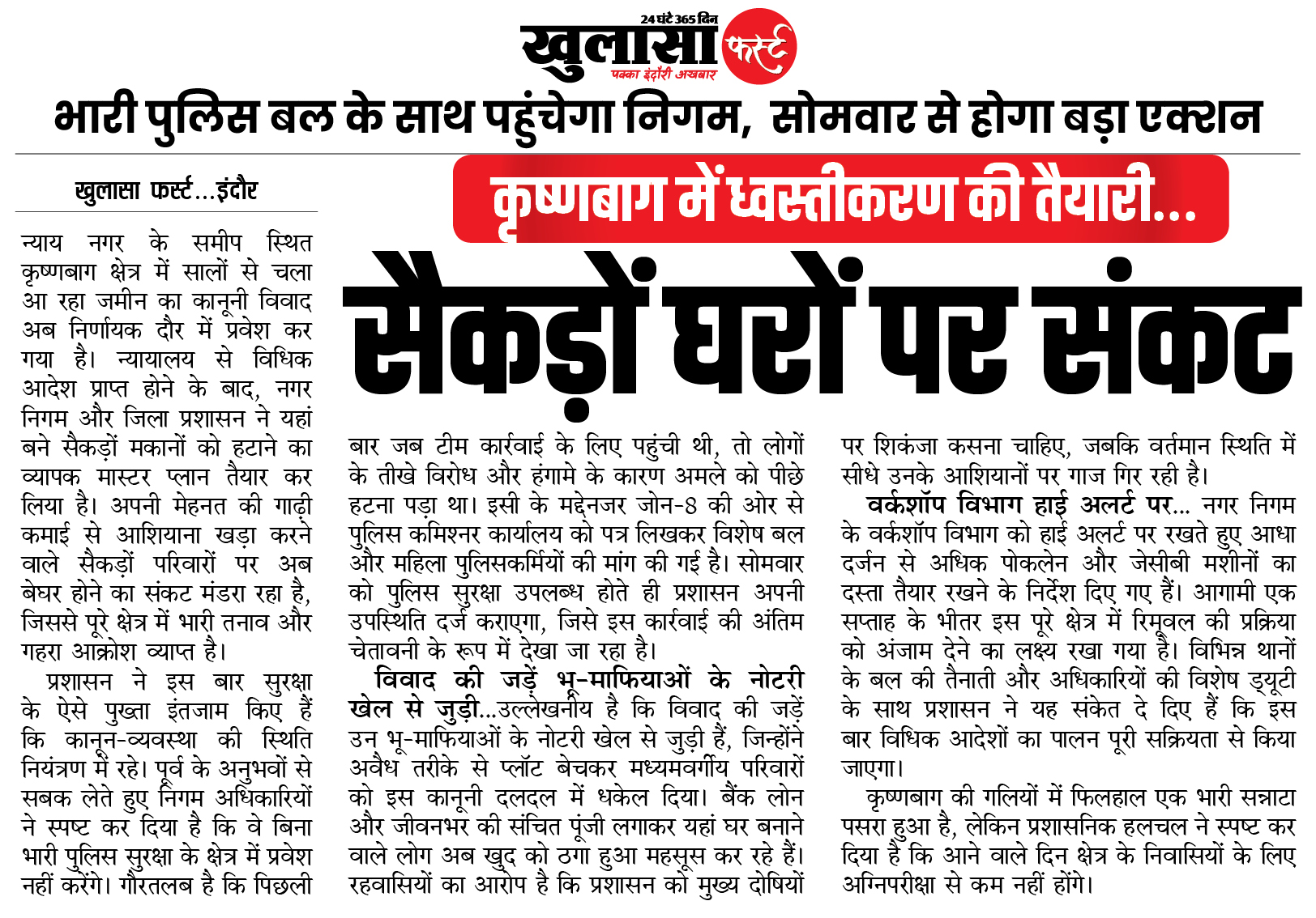कृष्णबाग की गलियों में फिलहाल एक भारी सन्नाटा पसरा हुआ है, लेकिन प्रशासनिक हलचल ने स्पष्ट कर दिया है कि आने वाले दिन क्षेत्र के निवासियों के लिए अग्निपरीक्षा से कम नहीं होंगे।