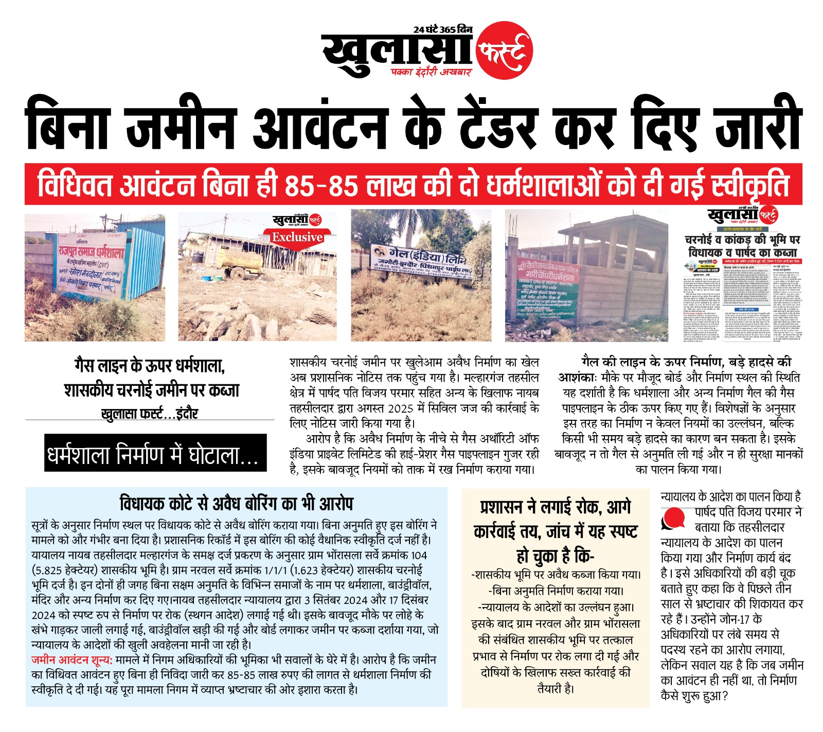 जमीन आवंटन शून्य: मामले में निगम अधिकारियों की भूमिका भी सवालों के घेरे में है। आरोप है कि जमीन का विधिवत आवंटन हुए बिना ही निविदा जारी कर 85-85 लाख रुपए की लागत से धर्मशाला निर्माण की स्वीकृति दे दी गई। यह पूरा मामला निगम में व्याप्त भ्रष्टाचार की ओर इशारा करता है।