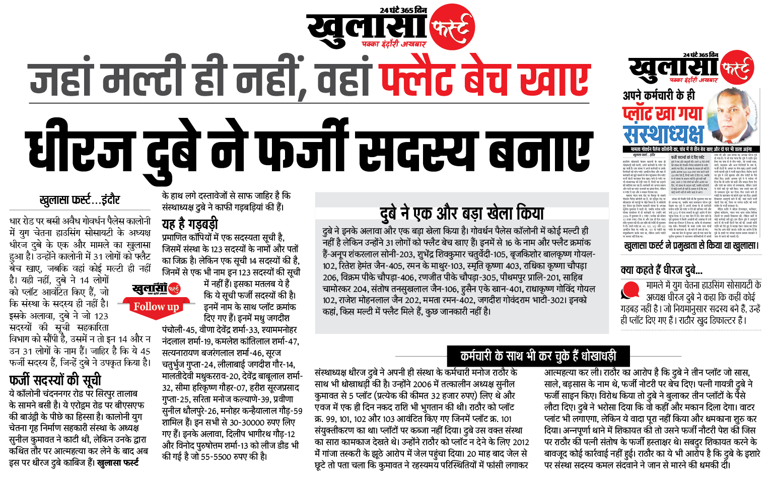 धार रोड पर बसी अवैध गोवर्धन पैलेस कालोनी में युग चेतना हाउसिंग सोसायटी के अध्यक्ष धीरज दुबे के एक और मामले का खुलासा हुआ है। उन्होंने कालोनी में 31 लोगों को फ्लैट बेच खाए, जबकि वहां कोई मल्टी ही नहीं है। यही नहीं, दुबे ने 14 लोगों को प्लॉट आवंटित किए हैं, जो कि संस्था के सदस्य ही नहीं है। इसके अलावा, दुबे ने जो 123 सदस्यों की सूची सहकारिता विभाग को सौंपी है, उसमें न तो इन 14 और न उन 31 लोगों के नाम हैं। जाहिर है कि ये 45 फर्जी सदस्य हैं, जिन्हें दुबे ने उपकृत किया है।