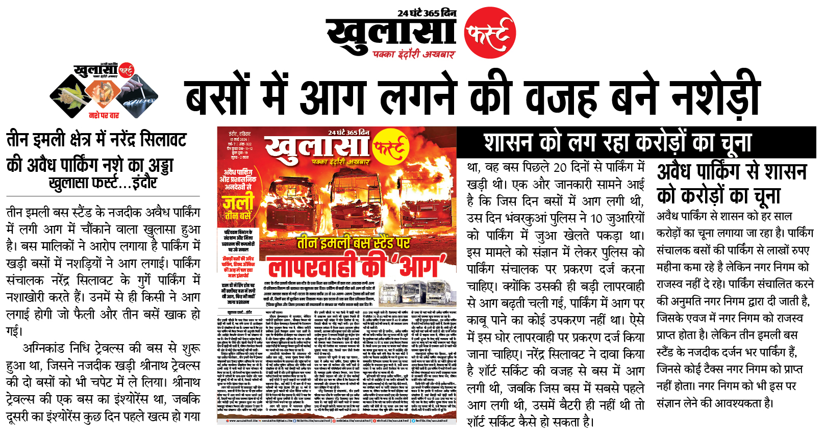 तीन इमली बस स्टैंड के नजदीक अवैध पार्किंग में लगी आग में चौंकाने वाला खुलासा हुआ है। बस मालिकों ने आरोप लगाया है पार्किंग में खड़ी बसों में नशड़ियों ने आग लगाई। पार्किंग संचालक नरेंद्र सिलावट के गुर्गे पार्किंग में नशाखोरी करते हैं। उनमें से ही किसी ने आग लगाई होगी जो फैली और तीन बसें खाक हो गई।