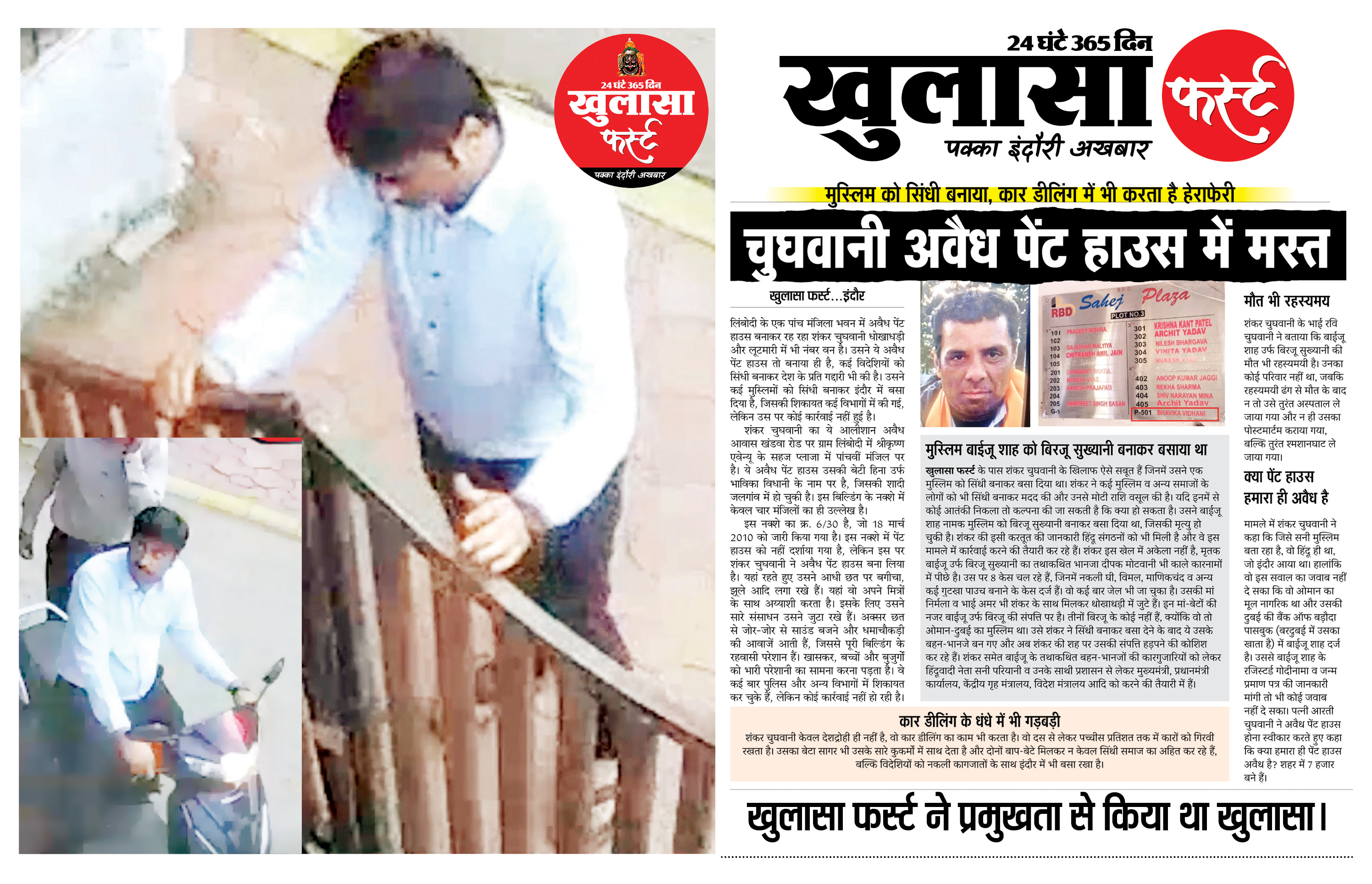लिंबोदी की बिल्डिंग में अवैध पेंट हाऊस में रह रहे धोखेबाज और जालसाज शंकर चुघवानी और बेटा सागर चुघवानी ने सुदामा नगर में एक मकान पर कब्जा करने की नीयत से बड़ा खेल खेला। दोनों बाप-बेटे ने मकान में ओमान-दुबई मूल के मुस्लिम बाईजू शाह को बिरजू सुख्यानी बनाकर बसा दिया और फिर पूरे मकान पर कब्जा जमाने की कोशिश की। मामला कोर्ट में है।