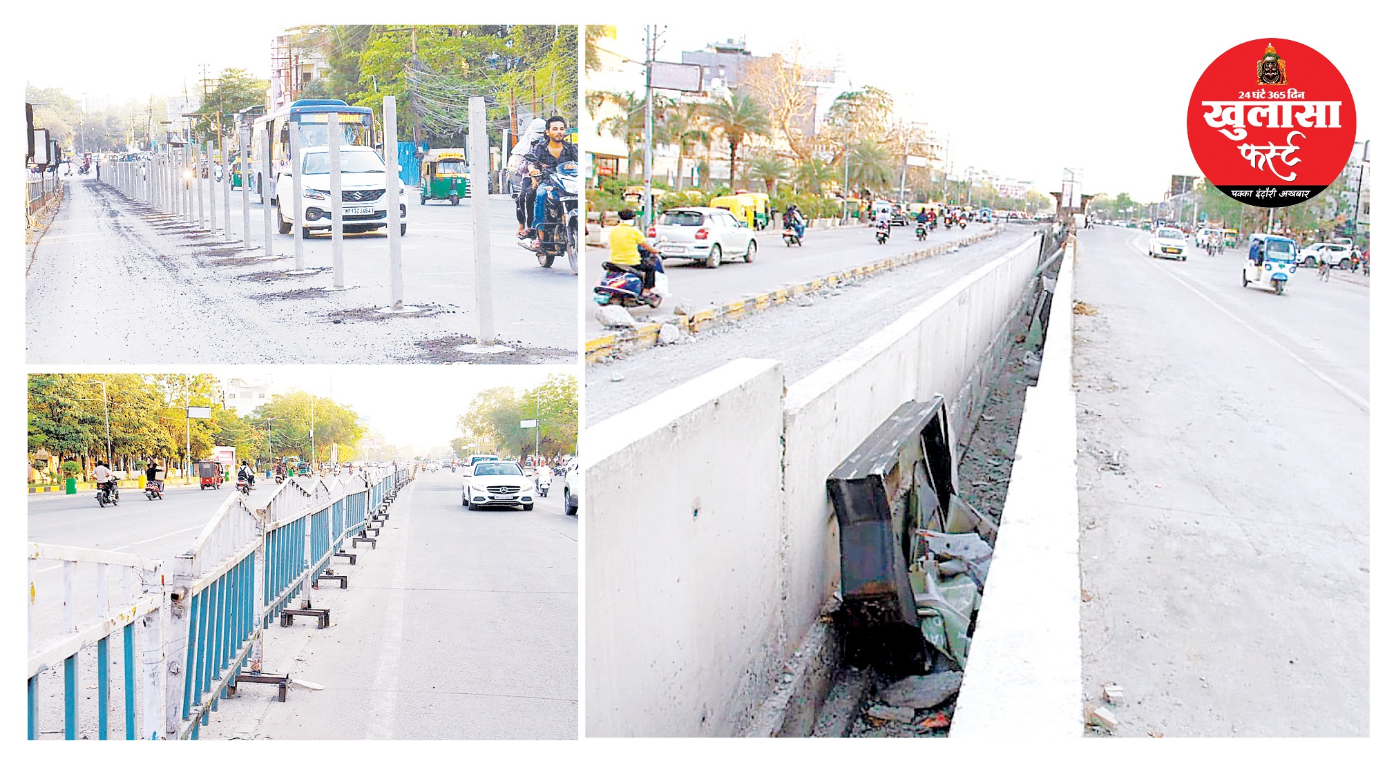 पलासिया से एलआईजी के बीच सीमेंट के खंभे खड़े कर दिए गए हैं। इन पर पतरे लगाकर डिवाइडर का काम लेंगे। वहीं जो पुरानी रेलिंग निकाली गई है, उसे भी सी 21 मॉल के सामने डिवाइडर की तरह उपयोग में ले रहे हैं।