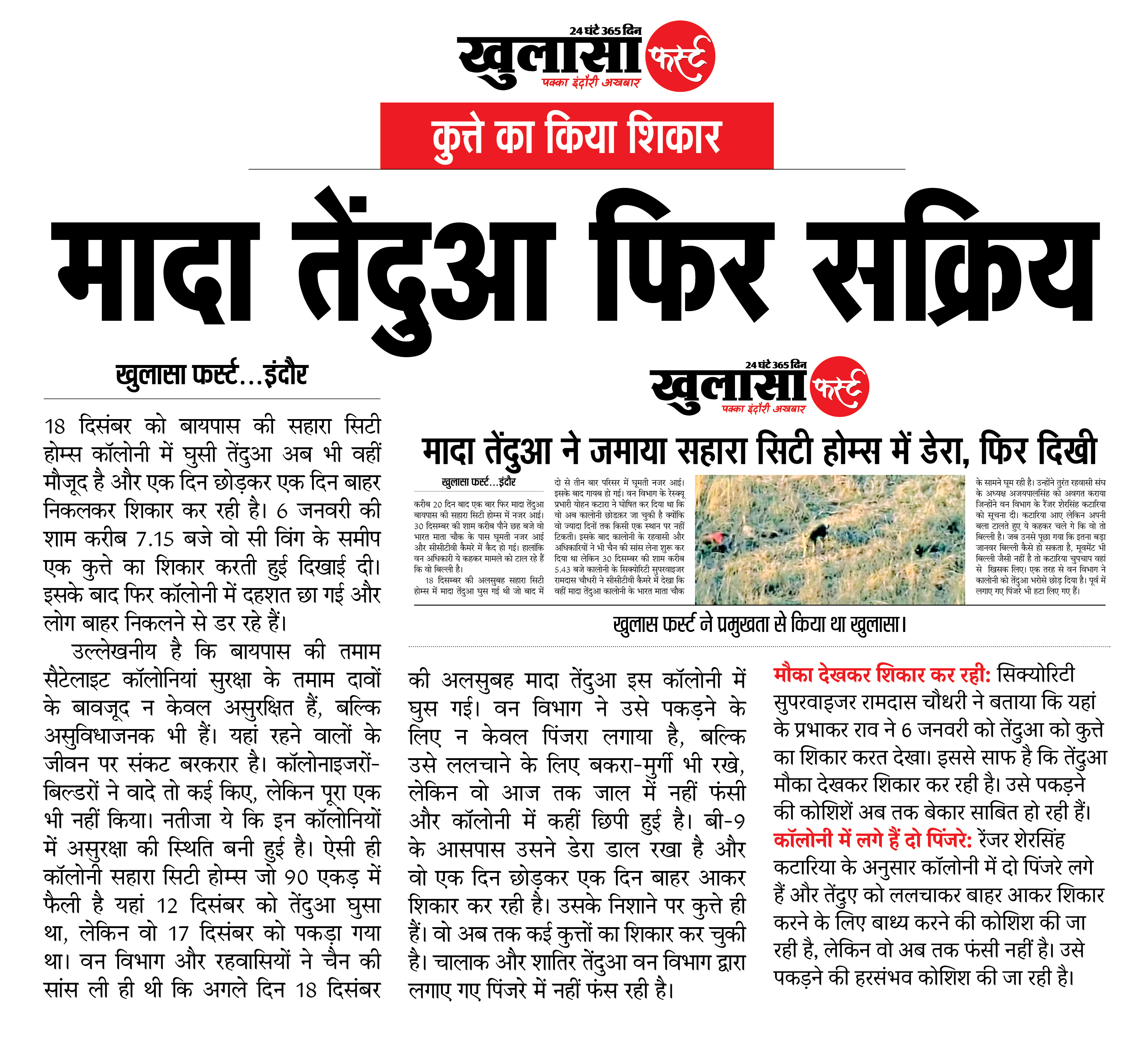 18 दिसंबर को बायपास की सहारा सिटी होम्स कॉलोनी में घुसी तेंदुआ अब भी वहीं मौजूद है और एक दिन छोड़कर एक दिन बाहर निकलकर शिकार कर रही है। 6 जनवरी की शाम करीब 7.15 बजे वो सी विंग के समीप एक कुत्ते का शिकार करती हुई दिखाई दी। इसके बाद फिर कॉलोनी में दहशत छा गई और लोग बाहर निकलने से डर रहे हैं।