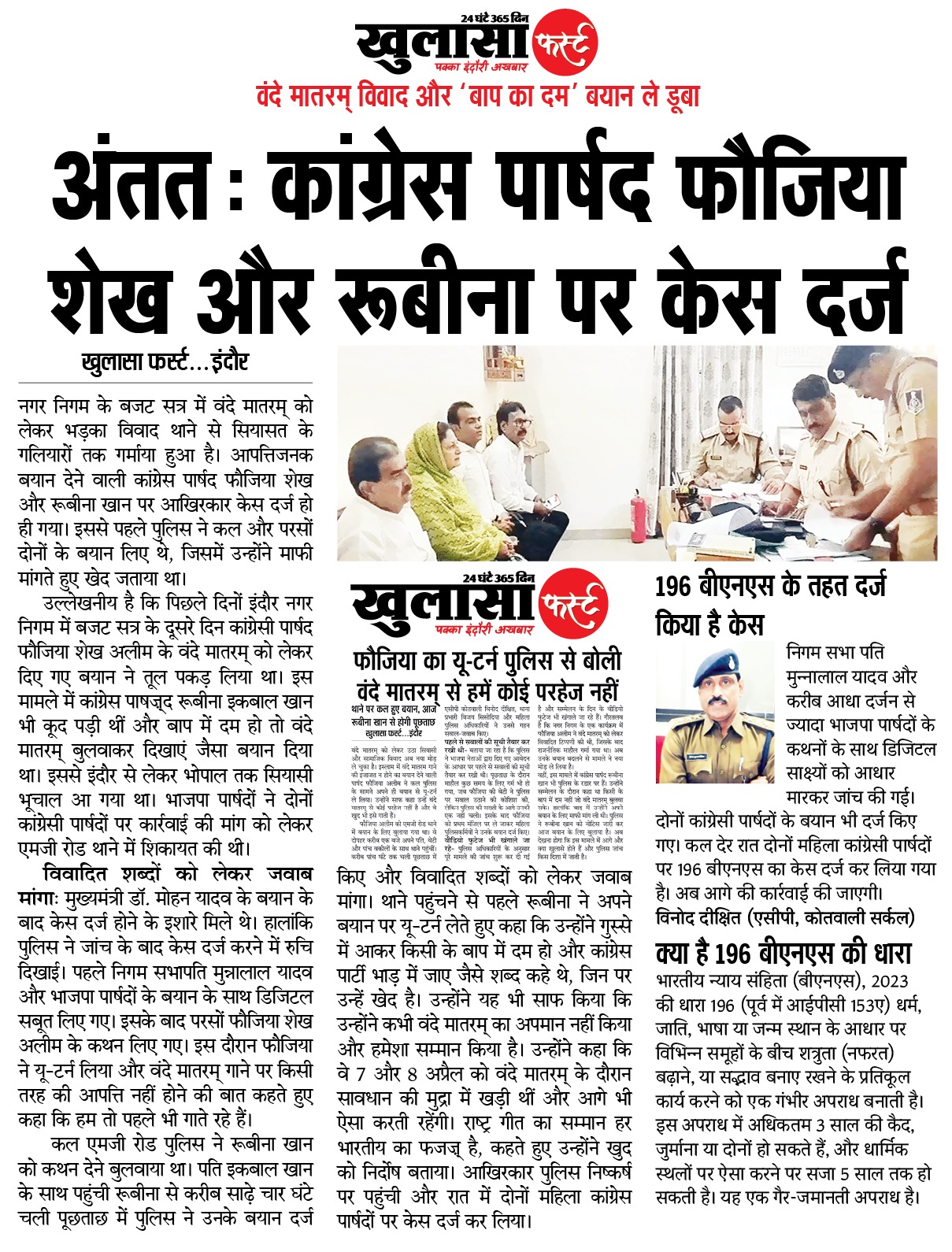 नगर निगम के बजट सत्र में वंदे मातरम् को लेकर भड़का विवाद थाने से सियासत के गलियारों तक गर्माया हुआ है। आपत्तिजनक बयान देने वाली कांग्रेस पार्षद फौजिया शेख और रूबीना खान पर आखिरकार केस दर्ज हो ही गया। इससे पहले पुलिस ने कल और परसों दोनों के बयान लिए थे, जिसमें उन्होंने माफी मांगते हुए खेद जताया था।