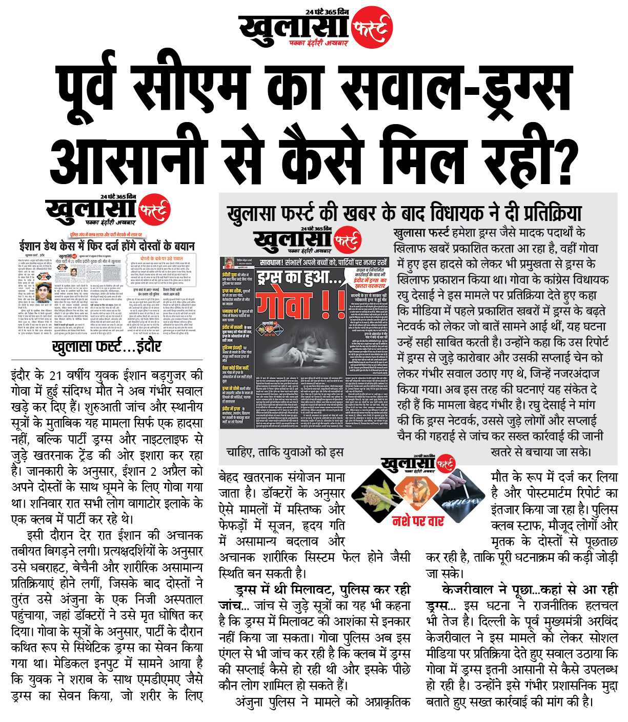 खुलासा फर्स्ट हमेशा ड्रग्स जैसे मादक पदार्थों के खिलाफ खबरें प्रकाशित करता आ रहा है, वहीं गोवा में हुए इस हादसे को लेकर भी प्रमुखता से ड्रग्स के खिलाफ प्रकाशन किया था। गोवा के कांग्रेस विधायक रघु देसाई ने इस मामले पर प्रतिक्रिया देते हुए कहा कि मीडिया में पहले प्रकाशित खबरों में ड्रग्स के बढ़ते नेटवर्क को लेकर जो बातें सामने आई थीं, यह घटना उन्हें सही साबित करती है।