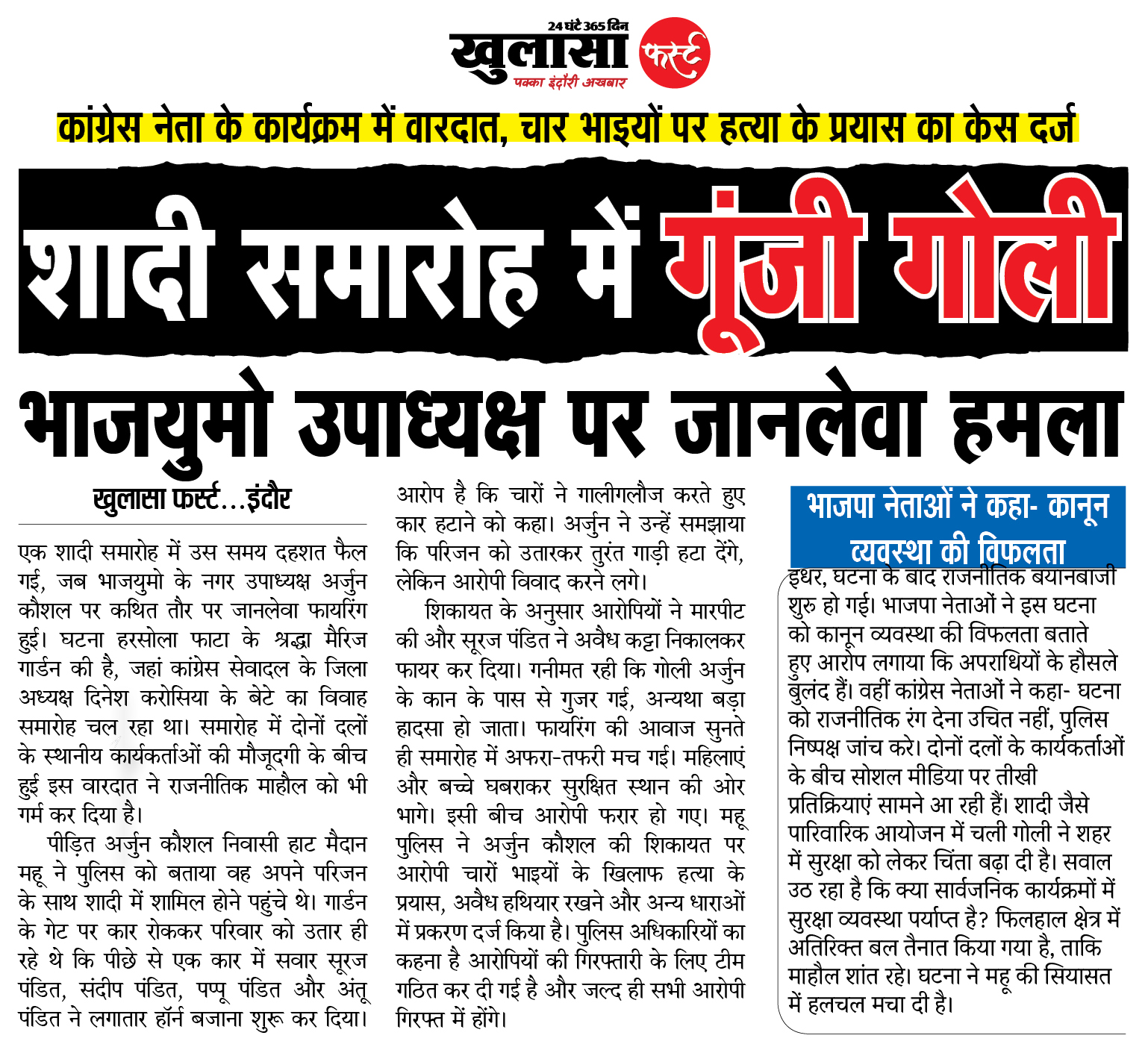 शादी समारोह में गूंजी गोली: कांग्रेस नेता के कार्यक्रम में वारदात; चार भाइयों पर हत्या के प्रयास का केस दर्ज