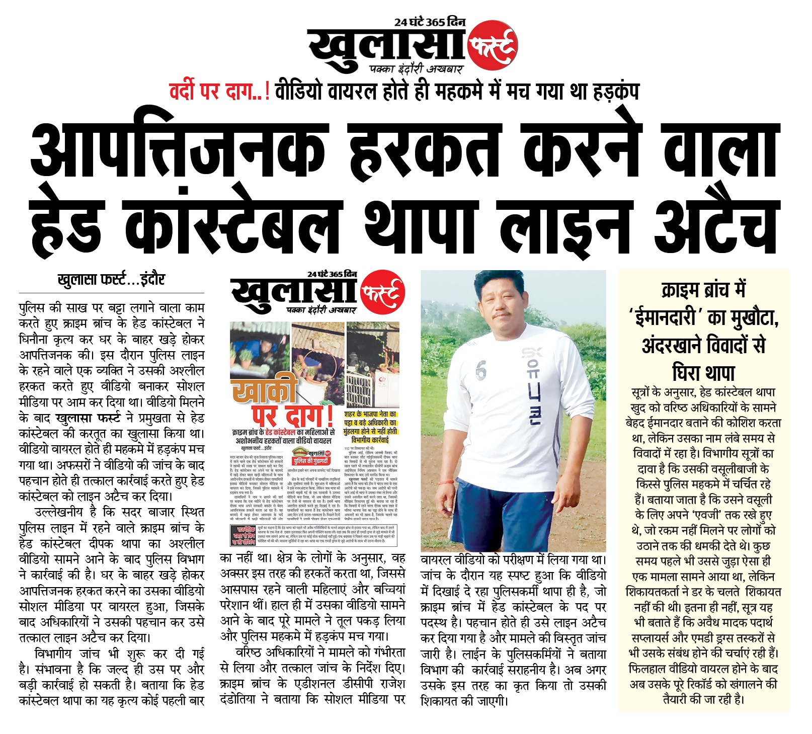 वीडियो मिलने के बाद खुलासा फर्स्ट ने प्रमुखता से हेड कांस्टेबल की करतूत का खुलासा किया था। वीडियो वायरल होते ही महकमे में हड़कंप मच गया था। अफसरों ने वीडियो की जांच के बाद पहचान होते ही तत्काल कार्रवाई करते हुए हेड कांस्टेबल को लाइन अटैच कर दिया।