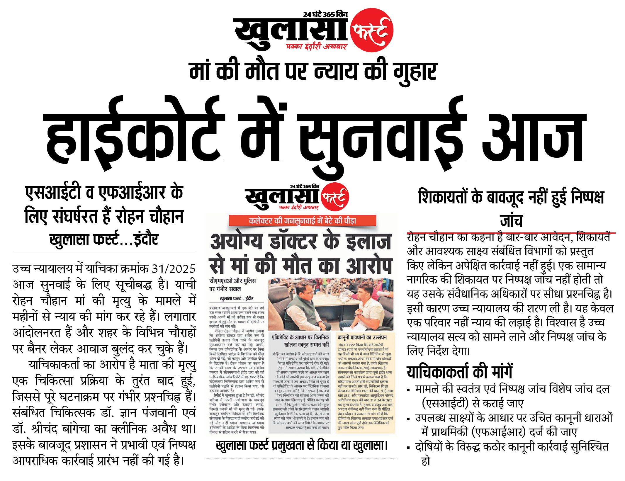 उच्च न्यायालय में याचिका क्रमांक 31/2025 आज सुनवाई के लिए सूचीबद्ध है। याची रोहन चौहान मां की मृत्यु के मामले में महीनों से न्याय की मांग कर रहे हैं। लगातार आंदोलनरत हैं और शहर के विभिन्न चौराहों पर बैनर लेकर आवाज बुलंद कर चुके हैं।