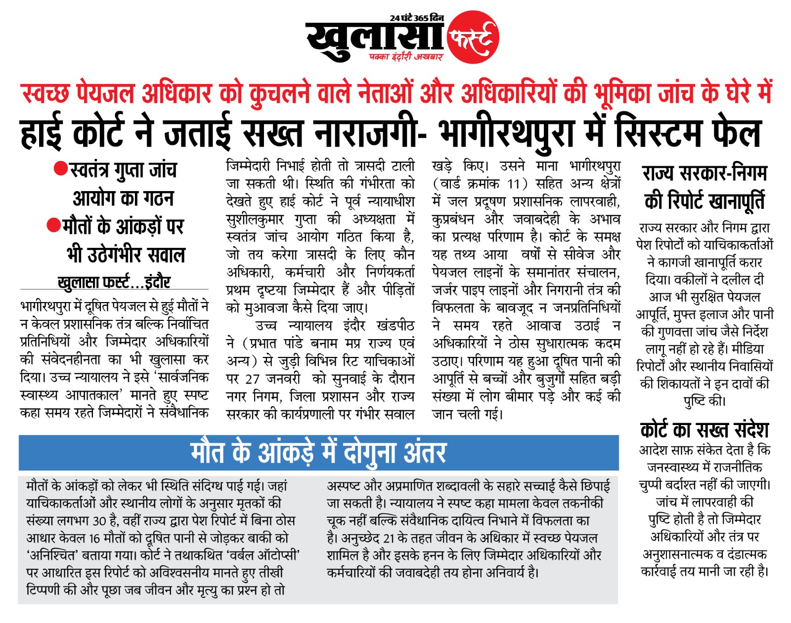 हाई कोर्ट ने जताई सख्त नाराजगी-भागीरथपुरा में सिस्टम फेल: स्वच्छ पेयजल अधिकार को कुचलने वाले नेताओं और अधिकारियों की भूमिका जांच के घेरे में