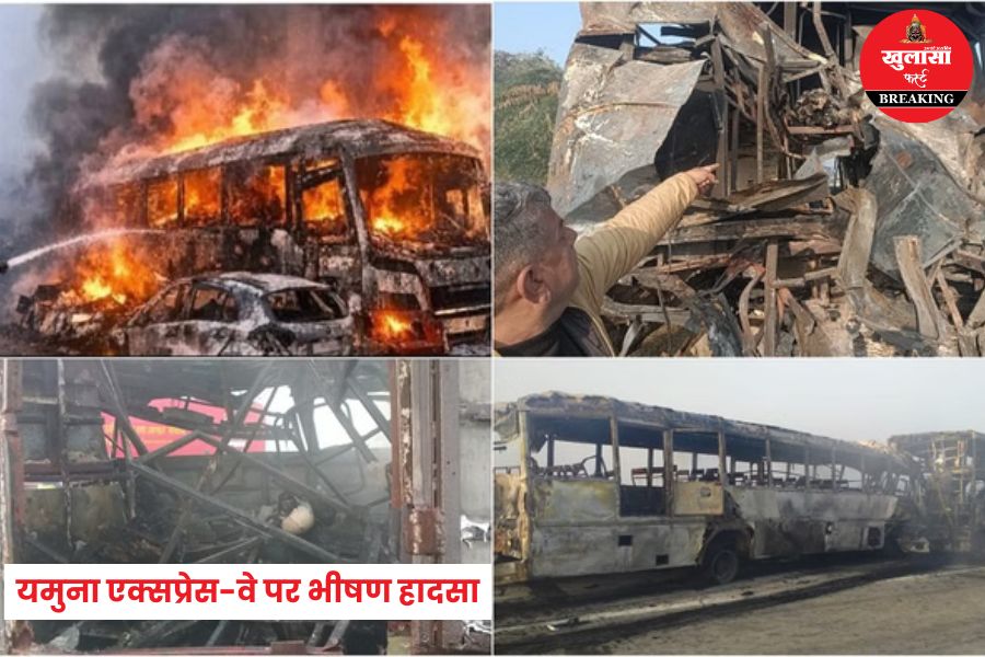 खुलासा फर्स्ट, मथुरा। यमुना एक्सप्रेस-वे पर घने कोहरे के कारण दर्दनाक हादसा हो गया। कोहरा अधिक होने के कारण 11 गाड़ियां (8 बसें और 3 कारें) आपस में भिड़ गईं, जिसके तुरंत बाद कई गाड़ियों में भीषण आग लग