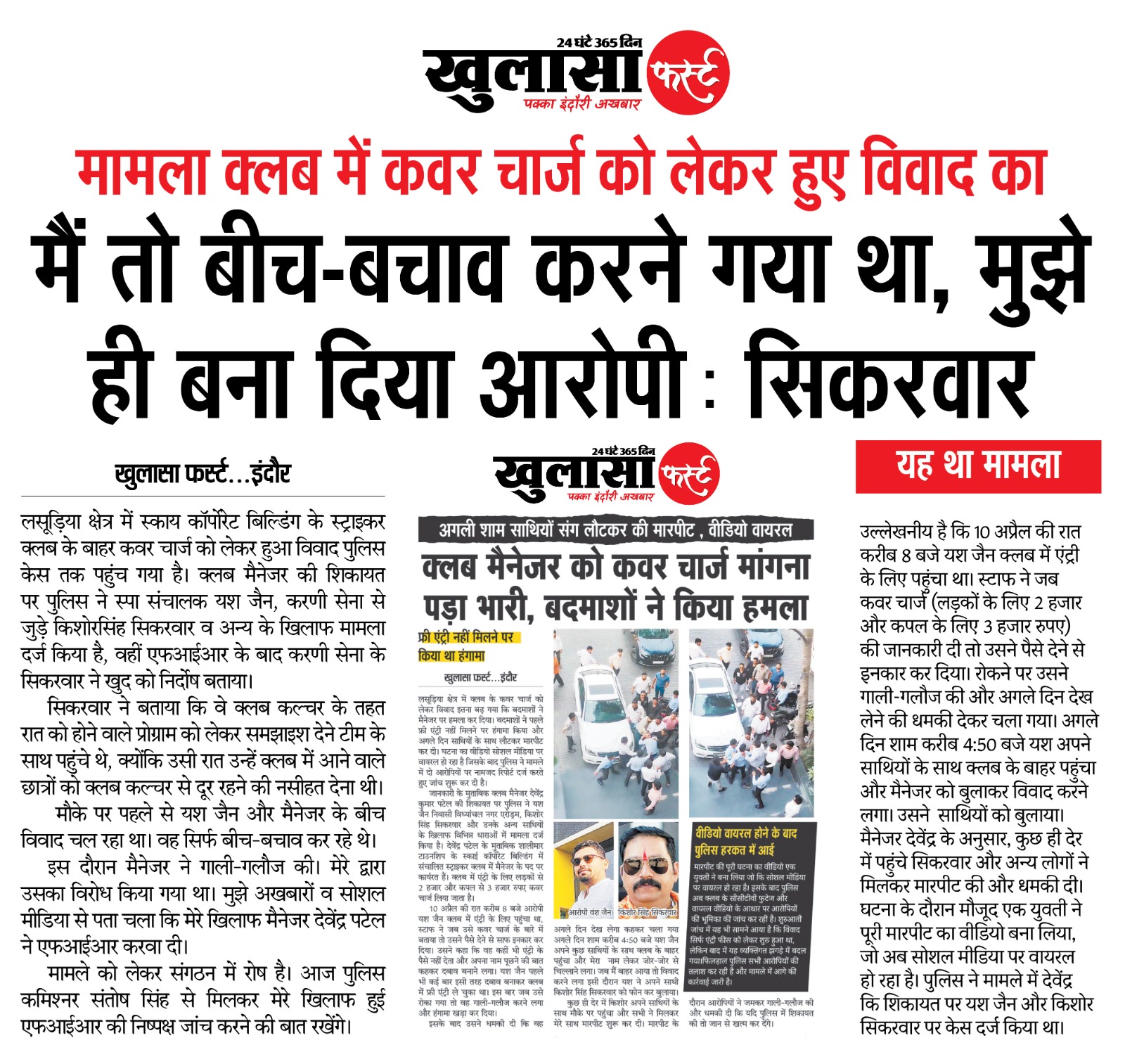 लसूड़िया क्षेत्र में स्काय कॉर्पोरेट बिल्डिंग के स्ट्राइकर क्लब के बाहर कवर चार्ज को लेकर हुआ विवाद पुलिस केस तक पहुंच गया है। क्लब मैनेजर की शिकायत पर पुलिस ने स्पा संचालक यश जैन, करणी सेना से जुड़े किशोरसिंह सिकरवार व अन्य के खिलाफ मामला दर्ज किया है, वहीं एफआईआर के बाद करणी सेना के सिकरवार ने खुद को निर्दोष बताया।