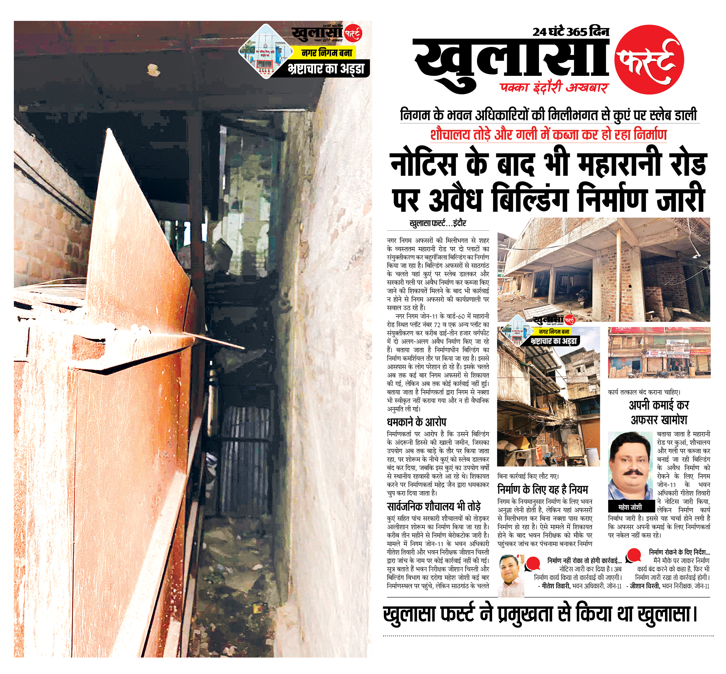 निगम के बिल्डिंग अफसरों की मिलीभगत से अवैध निर्माण की संख्या लगातार बढ़ रही है। ऐसे एक मामले का खुलासा खुलासा फर्स्ट कर रहा है। इस मामले में निगम जोन 11 के वार्ड 60 महारानी रोड पर निर्माणकर्ता महेन्द्र जैन द्वारा बिल्डिंग का निर्माण किया जा रहा है। बताया जाता है जैन ने नगर निगम से नक्शा भी पास नहीं कराया है।