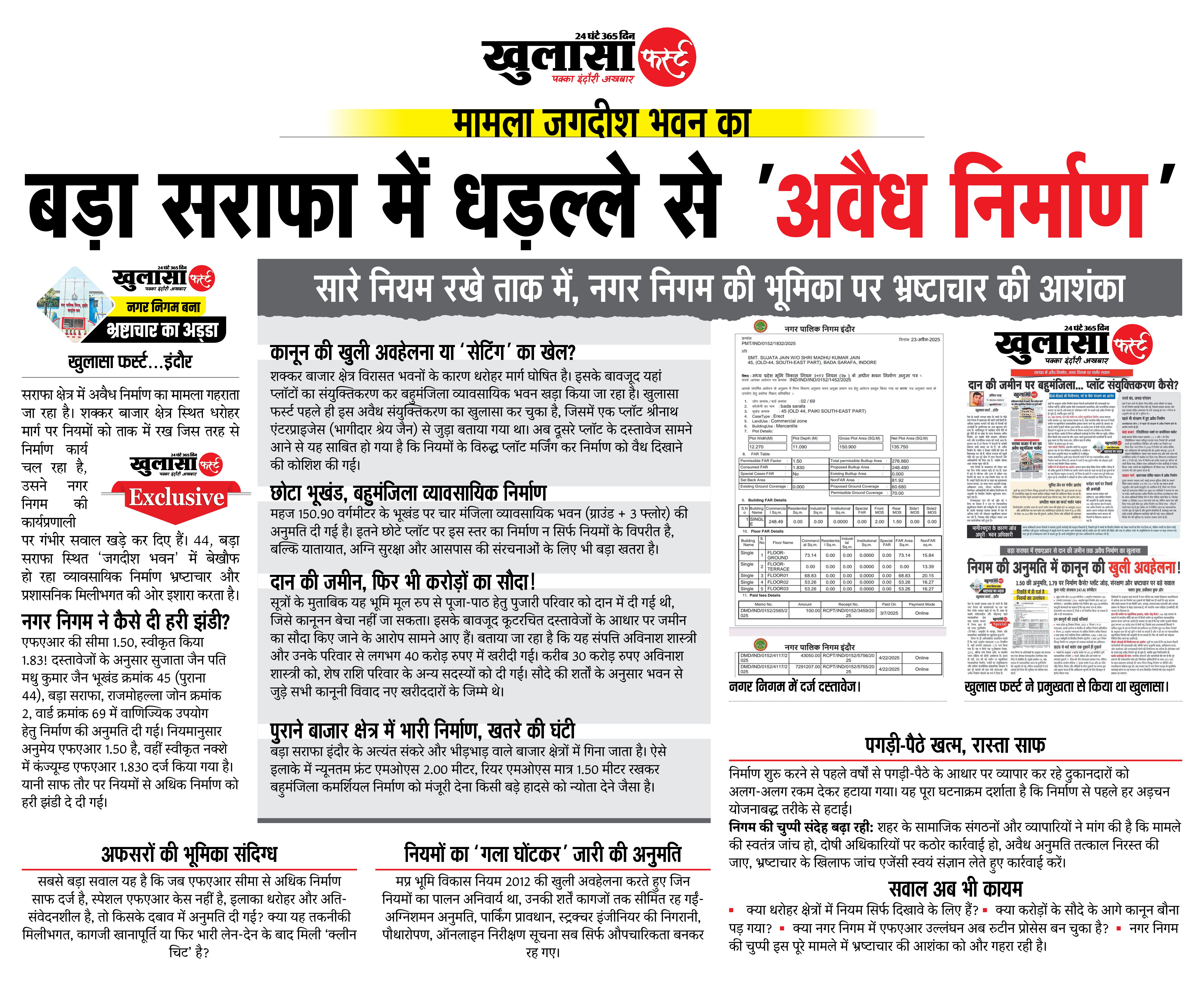 शक्कर बाजार क्षेत्र विरासत भवनों के कारण धरोहर मार्ग घोषित है। इसके बावजूद यहां प्लॉटों का संयुक्तिकरण कर बहुमंजिला व्यावसायिक भवन खड़ा किया जा रहा है। खुलासा फर्स्ट पहले ही इस अवैध संयुक्तिकरण का खुलासा कर चुका है, जिसमें एक प्लॉट श्रीनाथ एंटरप्राइजेस (भागीदार श्रेय जैन) से जुड़ा बताया गया था। अब दूसरे प्लॉट के दस्तावेज सामने आने से यह साबित हो गया है कि नियमों के विरुद्ध प्लॉट मर्जिंग कर निर्माण को वैध दिखाने की कोशिश की गई।