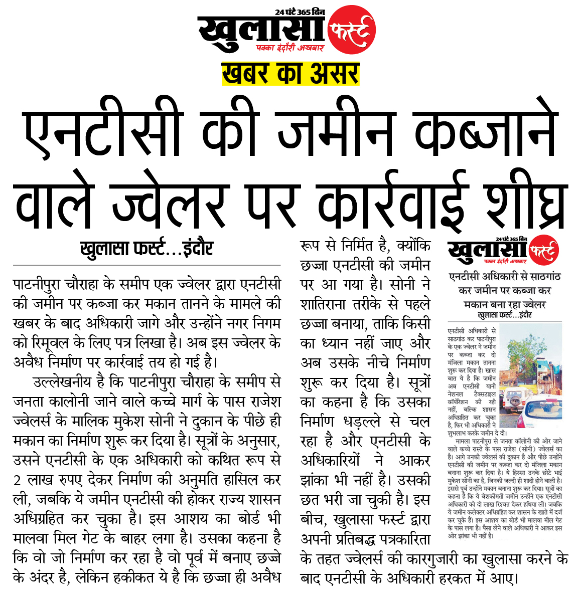 उल्लेखनीय है कि पाटनीपुरा चौराहा के समीप से जनता कालोनी जाने वाले कच्चे मार्ग के पास राजेश ज्वेलर्स के मालिक मुकेश सोनी ने दुकान के पीछे ही मकान का निर्माण शुरू कर दिया है। सूत्रों के अनुसार, उसने एनटीसी के एक अधिकारी को कथित रूप से 2 लाख रुपए देकर निर्माण की अनुमति हासिल कर ली, जबकि ये जमीन एनटीसी की होकर राज्य शासन अधिग्रहित कर चुका है।