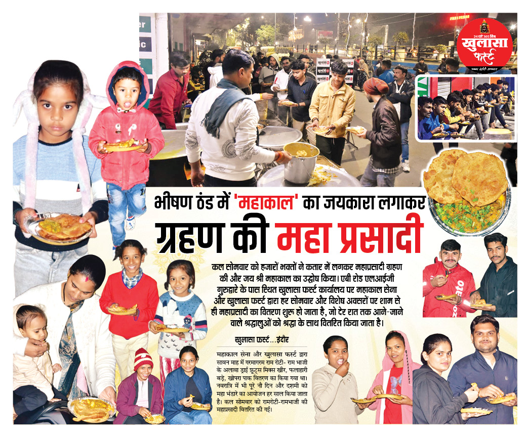 कल सोमवार को हजारों भक्तों ने कतार में लगकर महाप्रसादी ग्रहण की और जय श्री महाकाल का उद्घोष किया। एबी रोड एलआईजी गुरुद्वारे के पास स्थित खुलासा फर्स्ट कार्यालय पर महाकाल सेना और खुलासा फर्स्ट द्वारा हर सोमवार और विशेष अवसरों पर शाम से ही महाप्रसादी का वितरण शुरू हो जाता है, जो देर रात तक आने-जाने वाले श्रद्धालुओं को श्रद्धा के साथ वितरित किया जाता है।