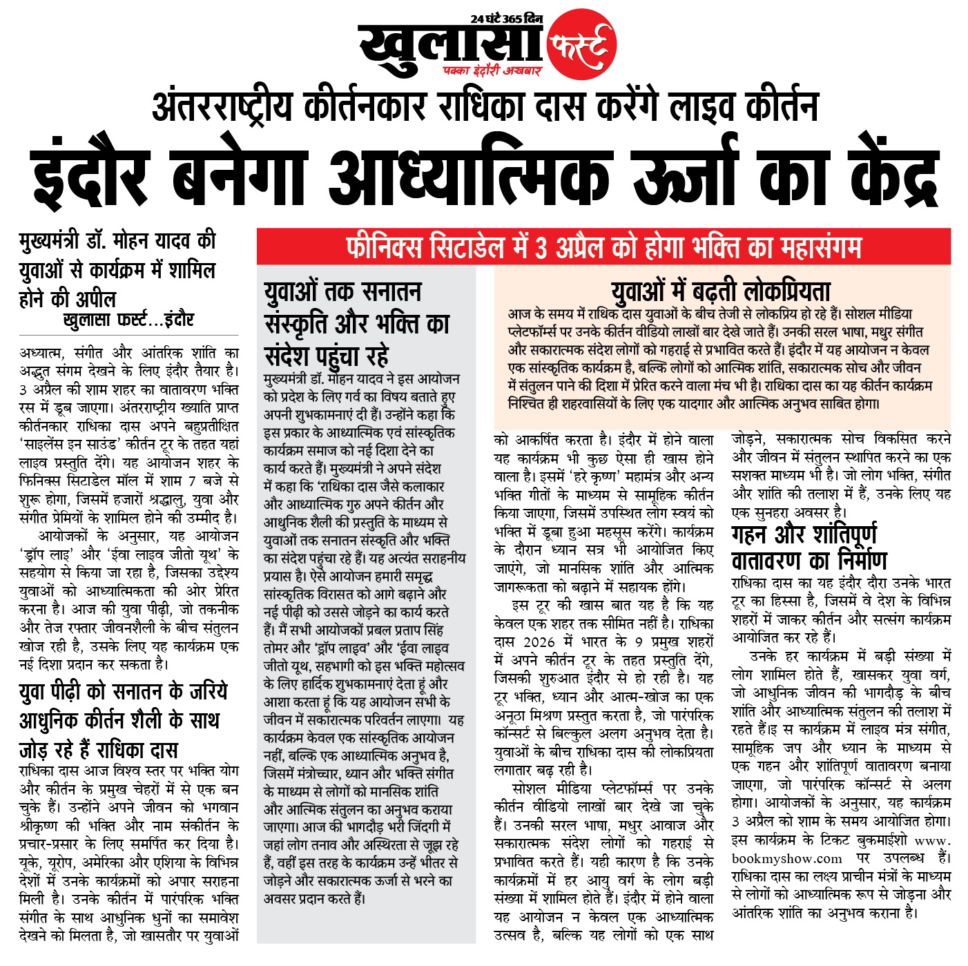 इंदौर बनेगा आध्यात्मिक ऊर्जा का केंद्र: अंतरराष्ट्रीय कीर्तनकार राधिका दास करेंगे लाइव कीर्तन