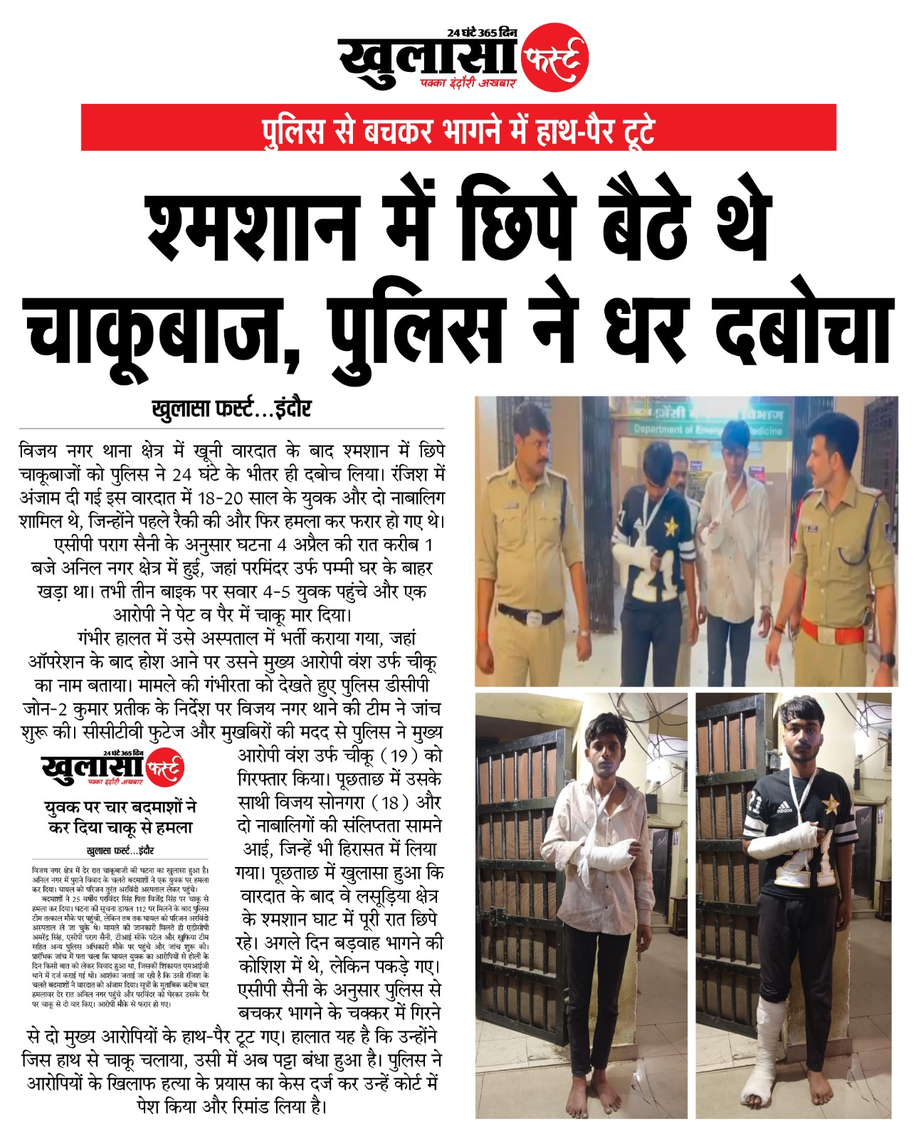 विजय नगर थाना क्षेत्र में खूनी वारदात के बाद श्मशान में छिपे चाकूबाजों को पुलिस ने 24 घंटे के भीतर ही दबोच लिया। रंजिश में अंजाम दी गई इस वारदात में 18-20 साल के युवक और दो नाबालिग शामिल थे, जिन्होंने पहले रैकी की और फिर हमला कर फरार हो गए थे।
