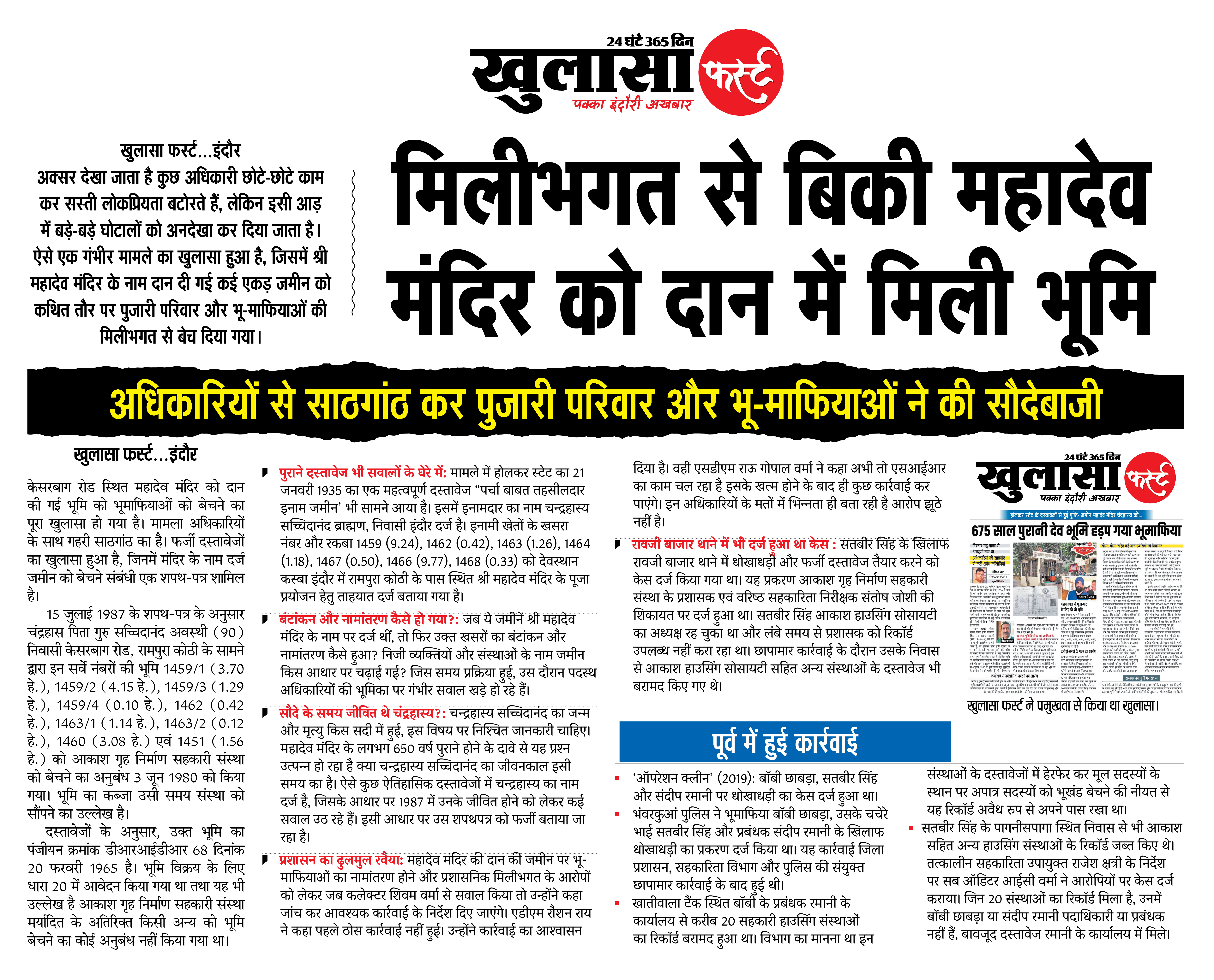 केसरबाग रोड स्थित महादेव मंदिर को दान की गई भूमि को भूमाफियाओं को बेचने का पूरा खुलासा हो गया है। मामला अधिकारियों के साथ गहरी साठगांठ का है। फर्जी दस्तावेजों का खुलासा हुआ है, जिनमें मंदिर के नाम दर्ज जमीन को बेचने संबंधी एक शपथ-पत्र शामिल है।