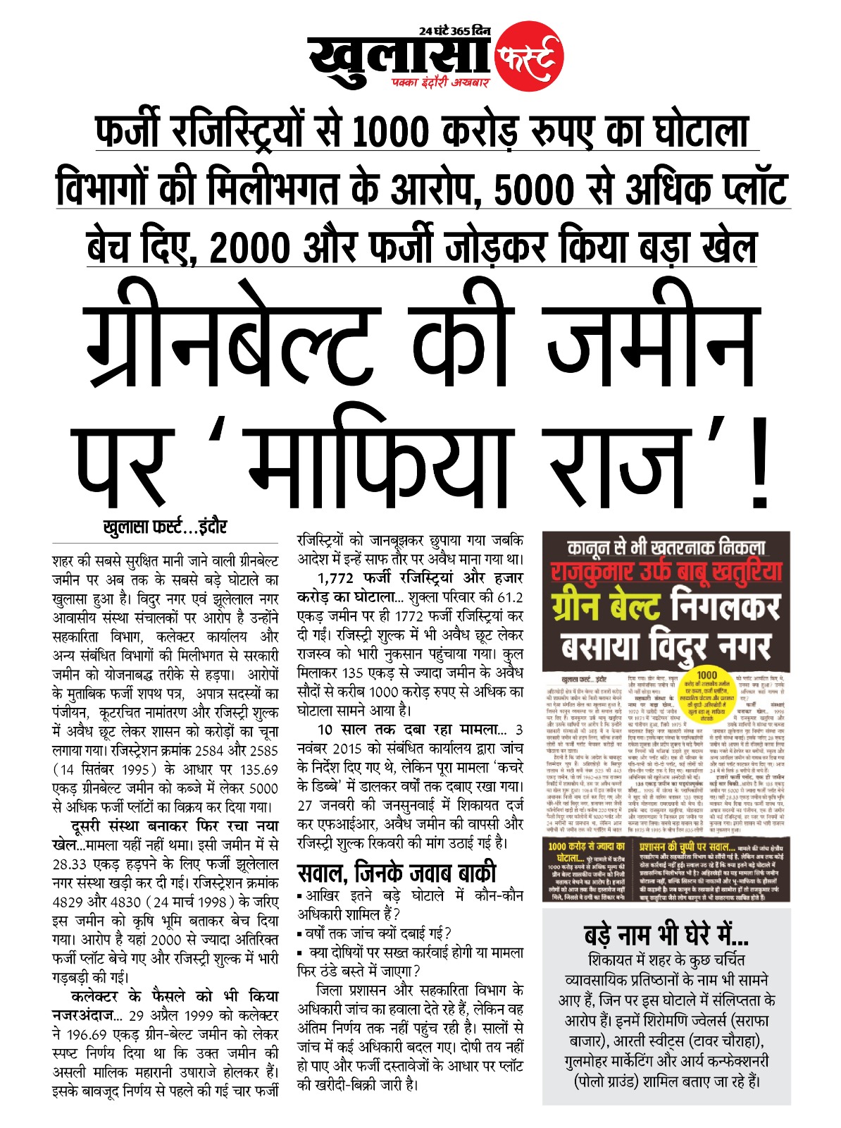 शहर की सबसे सुरक्षित मानी जाने वाली ग्रीनबेल्ट जमीन पर अब तक के सबसे बड़े घोटाले का खुलासा हुआ है। विदुर नगर एवं झूलेलाल नगर आवासीय संस्था संचालकों पर आरोप है उन्होंने सहकारिता विभाग, कलेक्टर कार्यालय और अन्य संबंधित विभागों की मिलीभगत से सरकारी जमीन को योजनाबद्ध तरीके से हड़पा।