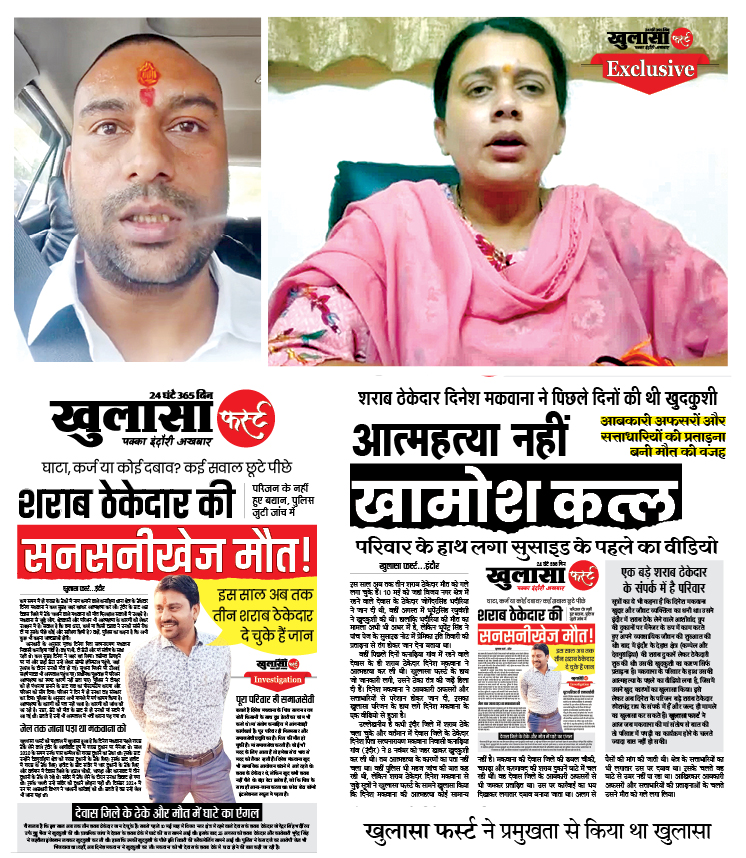 उल्लेखनीय है कि दिनेश पिता सत्यनारायण मकवाना निवासी कनाड़िया गांव ने 8 नवंबर को जहर खाकर खुदकुशी कर ली थी। 9 नवंबर को खुलासा फर्स्ट ने प्रमुखता से खबर प्रकाशित की थी। हालांकि तब आत्महत्या के कारणों का खुलासा नहीं हुआ था। इसके बाद खुलासा फर्स्ट ने सूत्रों से मिली जानकारी के आधार पर देवास आबकारी विभाग पर प्रताड़ित करने और आत्महत्या के लिए उकसाने की शंका जताते हुए 19 नवंबर को आत्महत्या नहीं, खामोश कत्ल शीर्षक से खबर प्रकाशित की थी। इस बीच कनाड़िया पुलिस ने दिनेश मकवाना की मां संतोष और उनकी पत्नी कविता के बयान लिए।