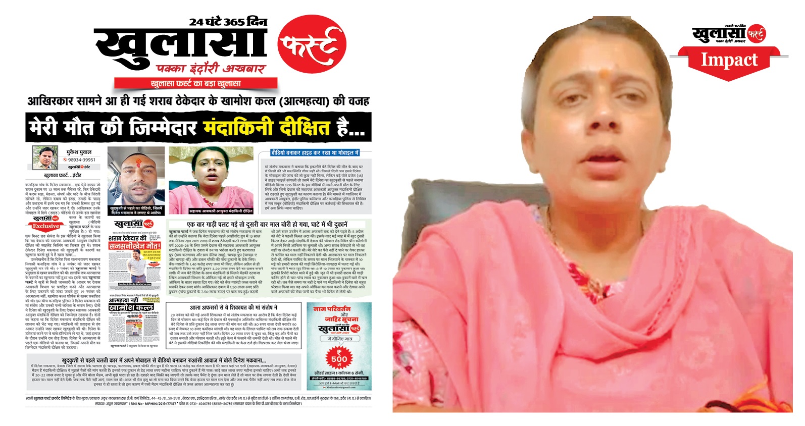 आरोप था कि वह दिनेश मकवाना की पांच शराब दुकानों से 7.50 लाख रुपए (प्रति दुकान 1.50 लाख) महीना मांगती थी। करीब 22 लाख रुपए दे चुका दिनेश मकवाना घाटे में चल रही दुकानों के कारण और पैसे देने में असमर्थ था। इसलिए उसने वीडियो बनाकर खुदकुशी कर ली। 5 दिसंबर के अंक में खुलासा फर्स्ट ने मामले को मेरी मौत की जिम्मेदार मंदाकिनी दीक्षित है शीर्षक से प्रमुखता से प्रकाशित की थी।
