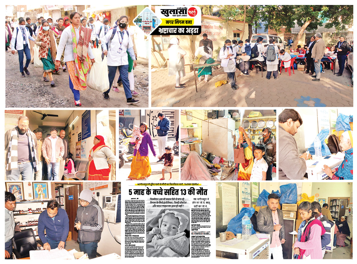 भागीरथपुरा में दूषित जल से 17 लोगों की मौत होने के एक सप्ताह बाद अब स्वास्थ्य विभाग पूरी तरह अलर्ट हो गया है। क्षेत्र के लगभग 5 हजार घरों में करीब 50 हजार की आबादी निवास करती है, जिनके स्वास्थ्य परीक्षण और जलजनित बीमारियों की रोकथाम के लिए बड़े पैमाने पर स्वास्थ्य अमला तैनात किया गया, जिसमें चिकित्सक, नर्सिंग ऑफिसर, सीएचओ, आशा एवं एएनएम शामिल हैं। प्रति 25 घरों पर 5 सदस्यों की एक टीम बनाई गई है। इस तरह करीब 1000 स्वास्थ्यकर्मियों की टीमें घर-घर जाकर सर्वे कर रही हैं।