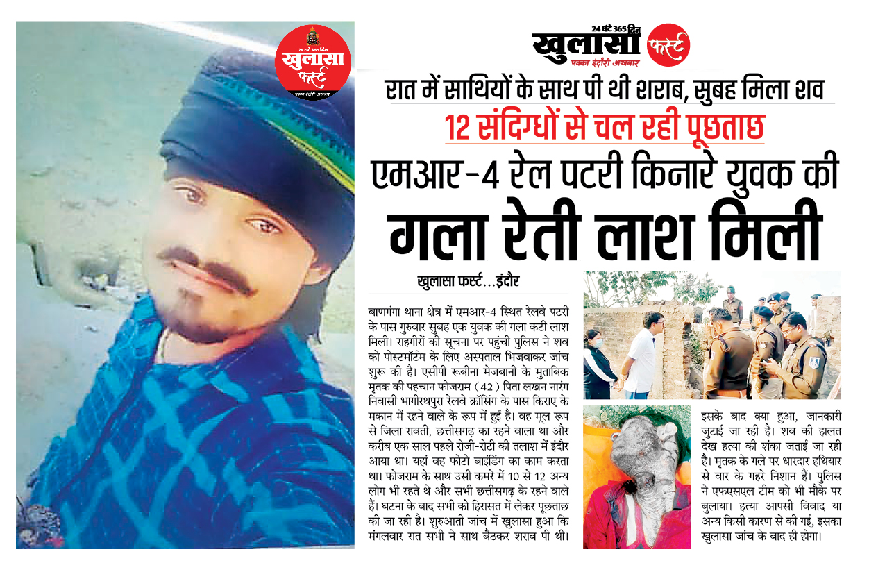 परसों रात खोजराम पिता लखन (42) निवासी भागीरथपुरा की गला रेंतकर हत्या हो गई थी। मूलत: छत्तीसगढ़ के खोजराम का शव कल सुबह एमआर-4 रेलवे पटरी के पास मिला था। पुलिस ने घटनास्थल के आसपास कैमरे खंगाले तो खुलासा हुआ रात में उसने भागीरथपुरा स्थित कलाली के पास कुछ लोगों के साथ शराब पी थी।