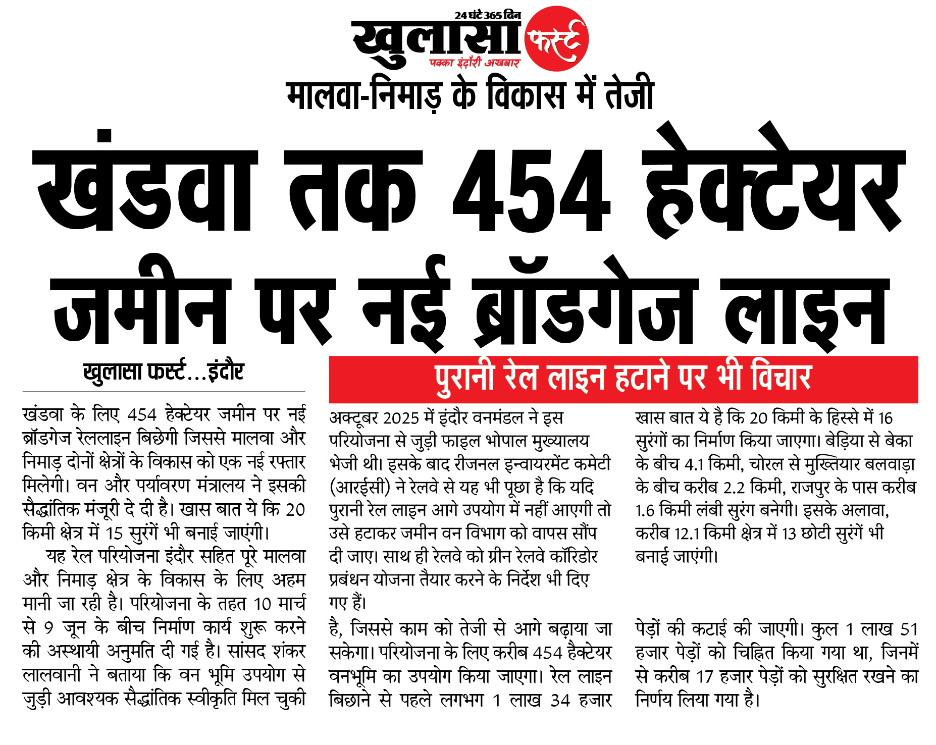 खंडवा के लिए 454 हेक्टेयर जमीन पर नई ब्रॉडगेज रेललाइन बिछेगी जिससे मालवा और निमाड़ दोनों क्षेत्रों के विकास को एक नई रफ्तार मिलेगी। वन और पर्यावरण मंत्रालय ने इसकी सैद्धांतिक मंजूरी दे दी है। खास बात ये कि 20 किमी क्षेत्र में 15 सुरंगें भी बनाई जाएंगी।