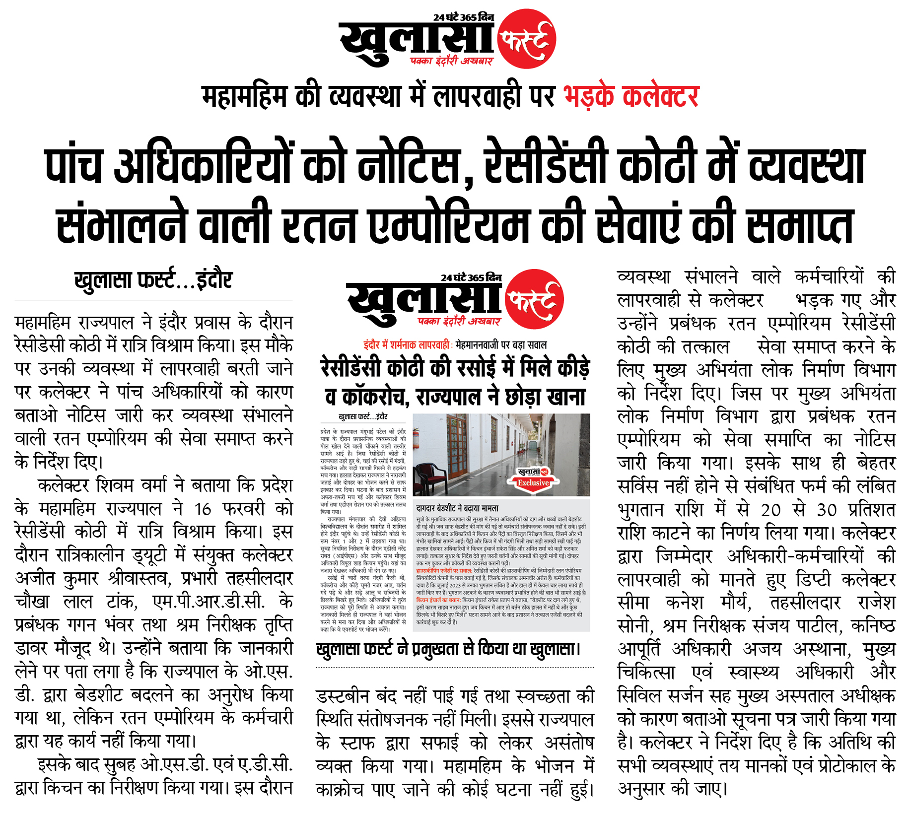पांच अधिकारियों को नोटिस: रेसीडेंसी कोठी में व्यवस्था संभालने वाली रतन एम्पोरियम की सेवाएं की समाप्त; महामहिम की व्यवस्था में लापरवाही पर भड़के कलेक्टर