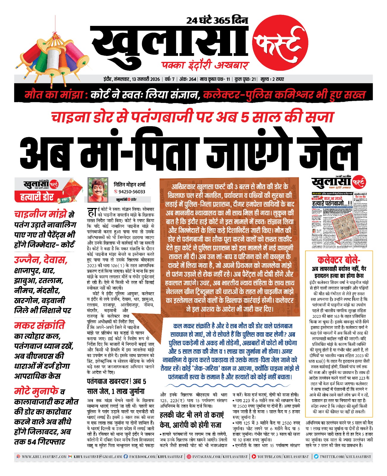 कल मकर संक्रांति है और वे सब मौत की डोर वाले पतंगबाज सावधान हो जाएं, जो ये सोचते हैं कि पुलिस क्या कर लेगी? अब पुलिस पकड़ेगी तो अकड़ भी तोड़ेगी, अखबारों में फोटो भी छपेगा और 5 साल तक की जेल व 1 लाख का जुर्माना भी होगा।