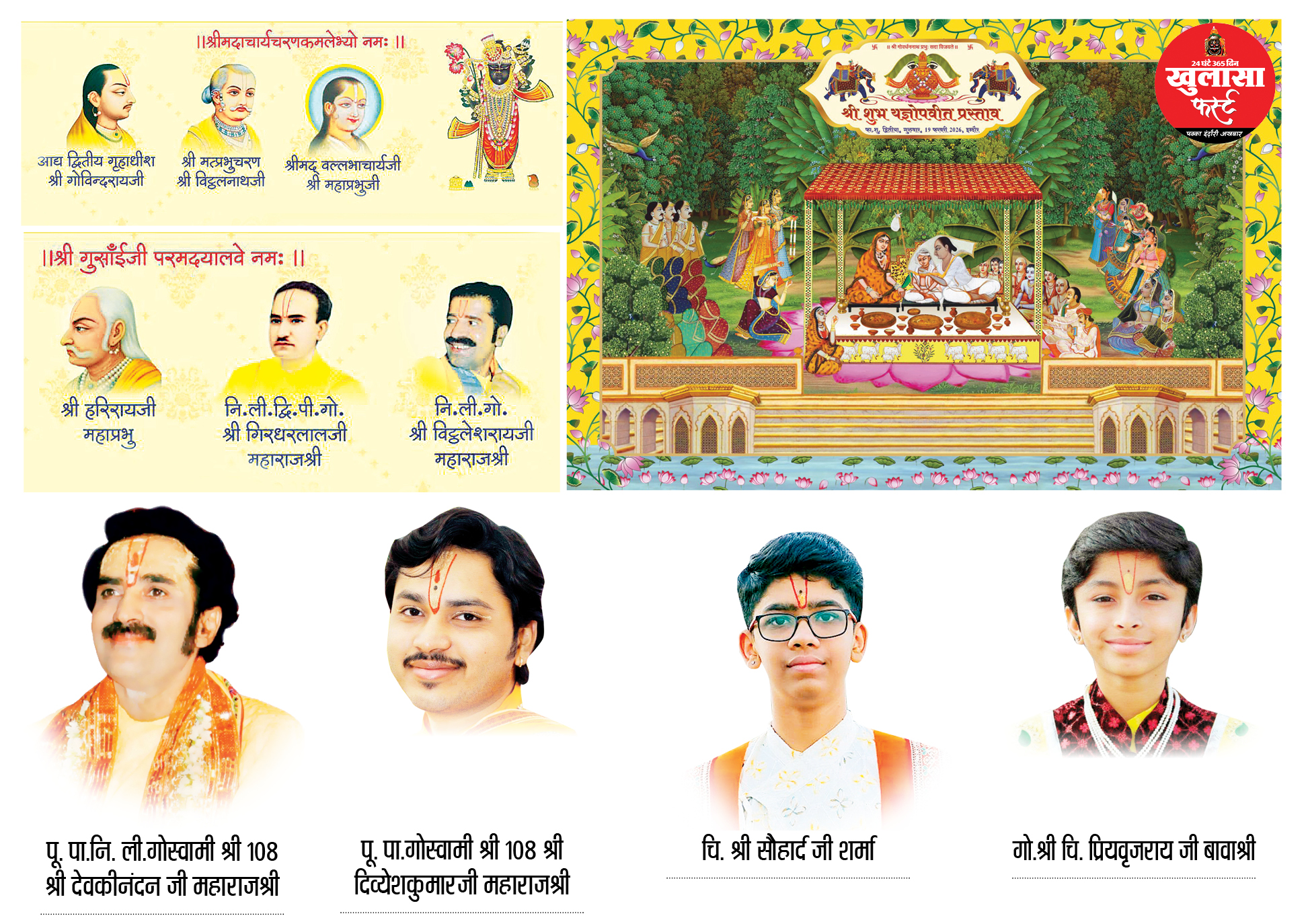 श्रीवल्लभकुल आचार्यो की अगवानी में बिछे वैष्णवजनों के पलक पांवड़े- इस शुभ प्रसंग में देशभर से वल्लभाचार्य परिवार से जुड़े वल्लभ आचार्य-बालक-बहु जी व बेटी जी पधार रहें हैं। इसमे नाथद्वारा, कांकरोली, कामवन, कोटा, ब्रजमण्डल, मुंबई से लेकर साथ समंदर पार अमेरिका से सिंगापुर तक से जजमान पधार रहें हैं।